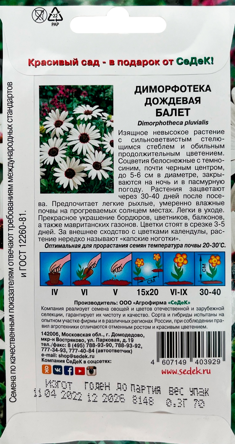 ДИМОРФОТЕКА БАЛЕТИзящное невысокое растение с сильноветвистым стелющимся стеблем и обильным продолжительным цветением. Соцветия белоснежные с темно-синим, почти черным центром, до 5-6 см в диаметре, закрываются на ночь и в пасмурную погоду. Растения зацветают через 30-40 дней после посева. Предпочитает легкие рыхлые, умеренно влажные почвы на прогреваемых солнцем местах. Легки в уходе. Прекрасное украшение бордюров, цветников, балконов, а также мавританских газонов. Цветки стоят в срезке 3 –5 дней. За внешнее сходство с цветками календулы, растение нередко называют «капские ноготки».