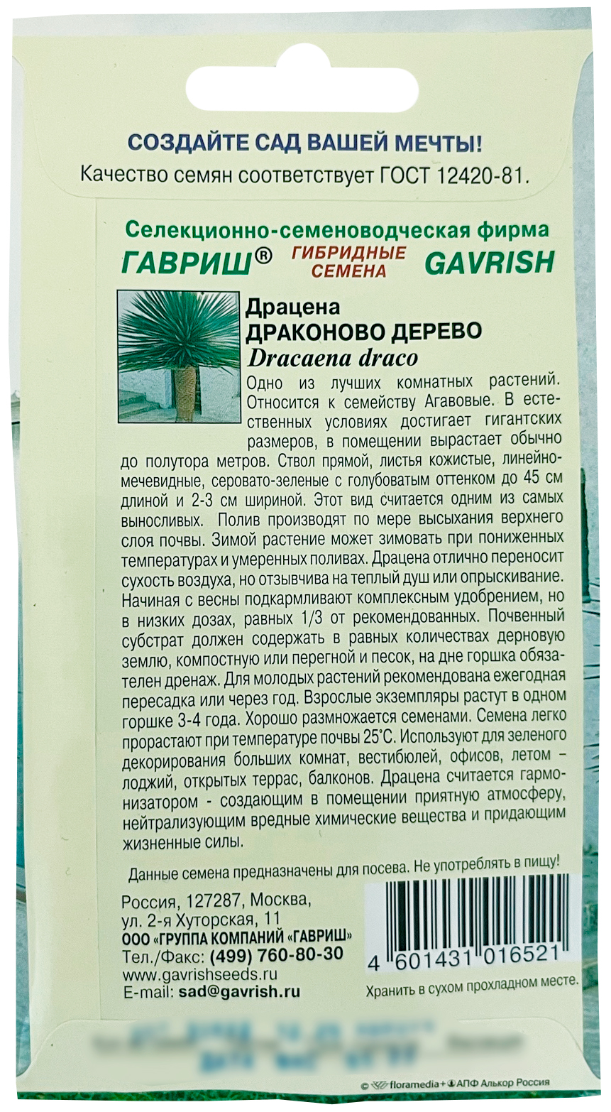Драцена Драконово Дерево ГАВРИШ (Dracaena Vand. ex L.)Одно из лучших комнатных растений. Относится к семейству Агавовые. В естественных условиях достигает гигантских размеров, в помещении вырастает обычно до полутора метров. Ствол прямой, листья кожистые, линейно-мечевидные, серовато-зеленые с голубоватым оттенком до 45 см длиной и 2- 3 см шириной. Этот вид считается одним из самых выносливых, светолюбив, теневынослив, не любит холода и сквозняков, избыточного увлажнения субстрата. Полив производят по мере высыхания верхнего слоя почвы. Зимой растение может зимовать при пониженных температурах, поливают его редко. Драцена отлично переносит сухость воздуха, но отзывчива на теплый душ или опрыскивание. Начиная с весны подкармливают комплексным удобрением, но в низких доза, равных 1/3 от рекомендованных. Почвенный субстрат должен содержать в равных количествах дерновую землю, компостную или перегной и песок, на дне горшка обязателен дренаж. Для молодых растений рекомендована ежегодная пересадка или через год. Взрослые экземпляры растут в одном горшке 3-4 года. Хорошо размножается семенами. Семена легко прорастают при температуре почвы 25 °C. Используют для зеленого декорирования больших комнат, вестибюлей, офисов, летом – лоджий, открытых террас, балконов. Драцена считается гармонизатором - создающим в помещении приятную атмосферу, нейтрализующим вредные химические вещества и придающим жизненные силы.