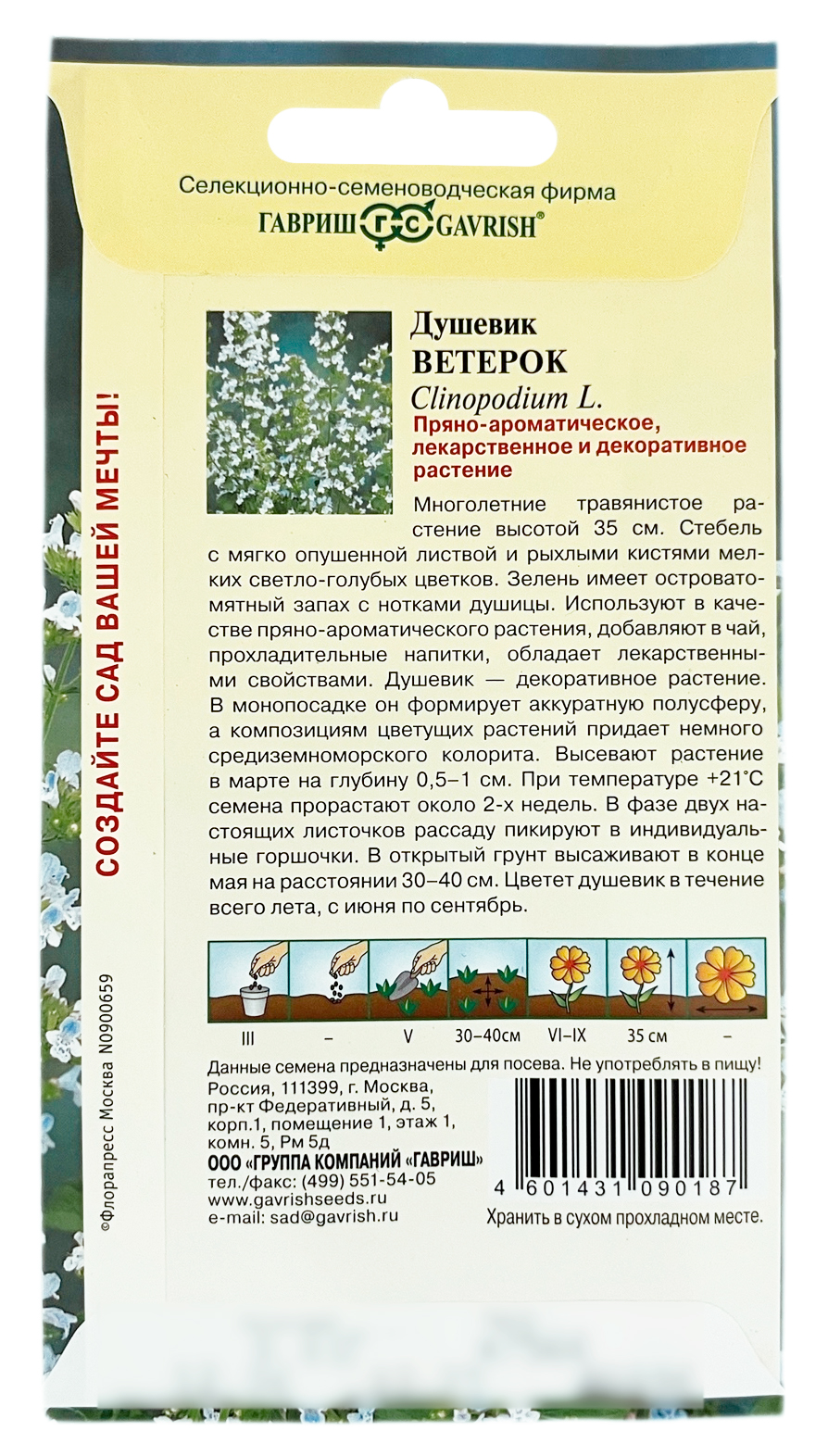 Душевик Ветерок ГАВРИШМноголетние травянистое растение высотой 35 см, образующее пышные кустики с мягко опушенной листвой и рыхлыми кистями мелких светло-голубых цветков. Зелень имеет островатомятный запах с нотками душицы. Используют в качестве пряно-ароматического растения, добавляют в чай, прохладительные напитки, обладает лекарственными свойствами. Душевик — декоративное растение. В монопосадке он формирует аккуратную полусферу, а композициям цветущих растений придает немного средиземноморского колорита. Высевают растение в марте на глубину 0,5-1 см. При температуре +21 "С семена прорастают около 2-х недель. В фазе двух настоящих листочков рассаду пикируют в индивидуальные горшочки. В открытый грунт высаживают в конце мая на расстоянии 30-40 см. Цветет душевик в течение всего лета, с июня по сентябрь.