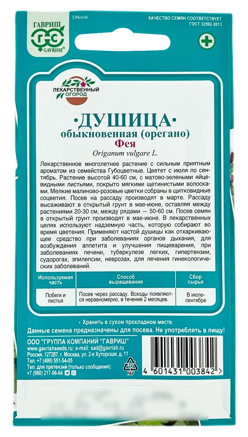 Душица обыкновенная орегано ФЕЯ ГАВРИШЛекарственное многолетнее растение с сильным приятным ароматом из семейства Губоцветные. Цветет с июля по сентябрь. Растение высотой 40-60 см, с матово-зелеными яйцевидными листьями, покрыто мягкими щетинистыми волосками. Мелкие малиново-розовые цветки, собраны в щитковидные соцветия. Посев на рассаду производят в марте. Рассаду высаживают в открытый грунт в мае — июне, оставляя между растениями 20-30 см, между рядами — 50-60 см. Посев семян в открытый грунт производят в мае — июне. В лекарственных целях используют надземную часть, которую собирают во время цветения. Применяют настой душицы как отхаркивающее средство при заболеваниях органов дыхания, для возбуждения аппетита и улучшения пищеварения, заболеваниях печени, туберкулезе легких, гипертензии, судорогах, эпилепсии, неврозах, для лечения гинекологических заболеваний.