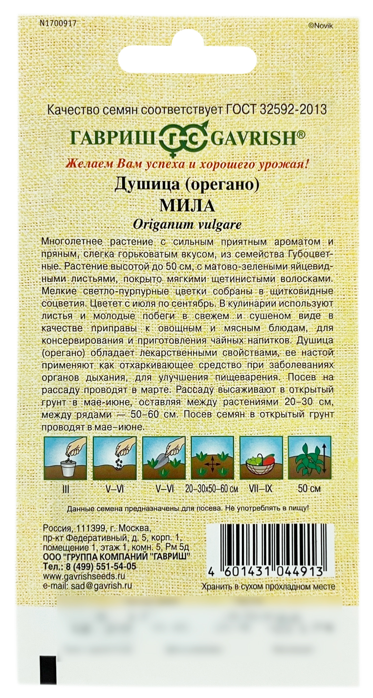 Душица орегано МИЛА ГАВРИШМноголетнее растение с сильным приятным ароматом и пряным, слегка горьковатым вкусом из семейства Губоцветные. Растение высотой до 50 см, с матово-зелеными яйцевидными листьями, покрыто мягкими щетинистыми волосками. Мелкие светло-пурпурные цветки, собраны в щитковидные соцветия. Цветет с июля по сентябрь. В кулинарии используются листья и молодые побеги в свежем и сушеном виде в качестве приправы к овощным и мясным блюдам, для консервирования и приготовления чайных напитков. Душица (орегано) обладает лекарственными свойствами, ее настой применяют как отхаркивающее средство при заболеваниях органов дыхания, для возбуждения аппетита и улучшения пищеварения, лечения гинекологических заболеваний. Посев на рассаду производят в марте. Рассаду высаживают в открытый грунт в мае — июне, оставляя между растениями 20-30 см, между рядами — 50-60 см. Посев семян в открытый грунт производят в мае — июне.