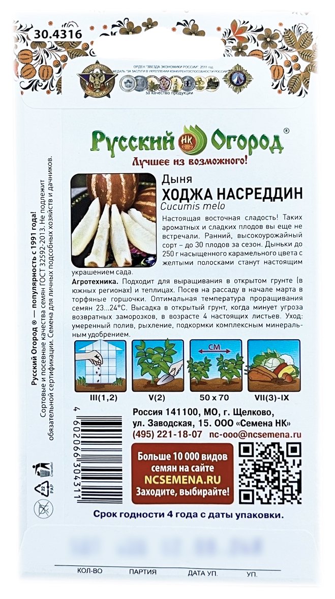Дыня ХОДЖА НАСРЕДДИН Русский ОгородНастоящая восточная сладость! Таких ароматных и сладких плодов вы еще не встречали. Ранний, высокоурожайный сорт – до 30 плодов за сезон. Дыньки до 250 г насыщенного карамельного цвета с желтыми полосками станут настоящим украшением сада.