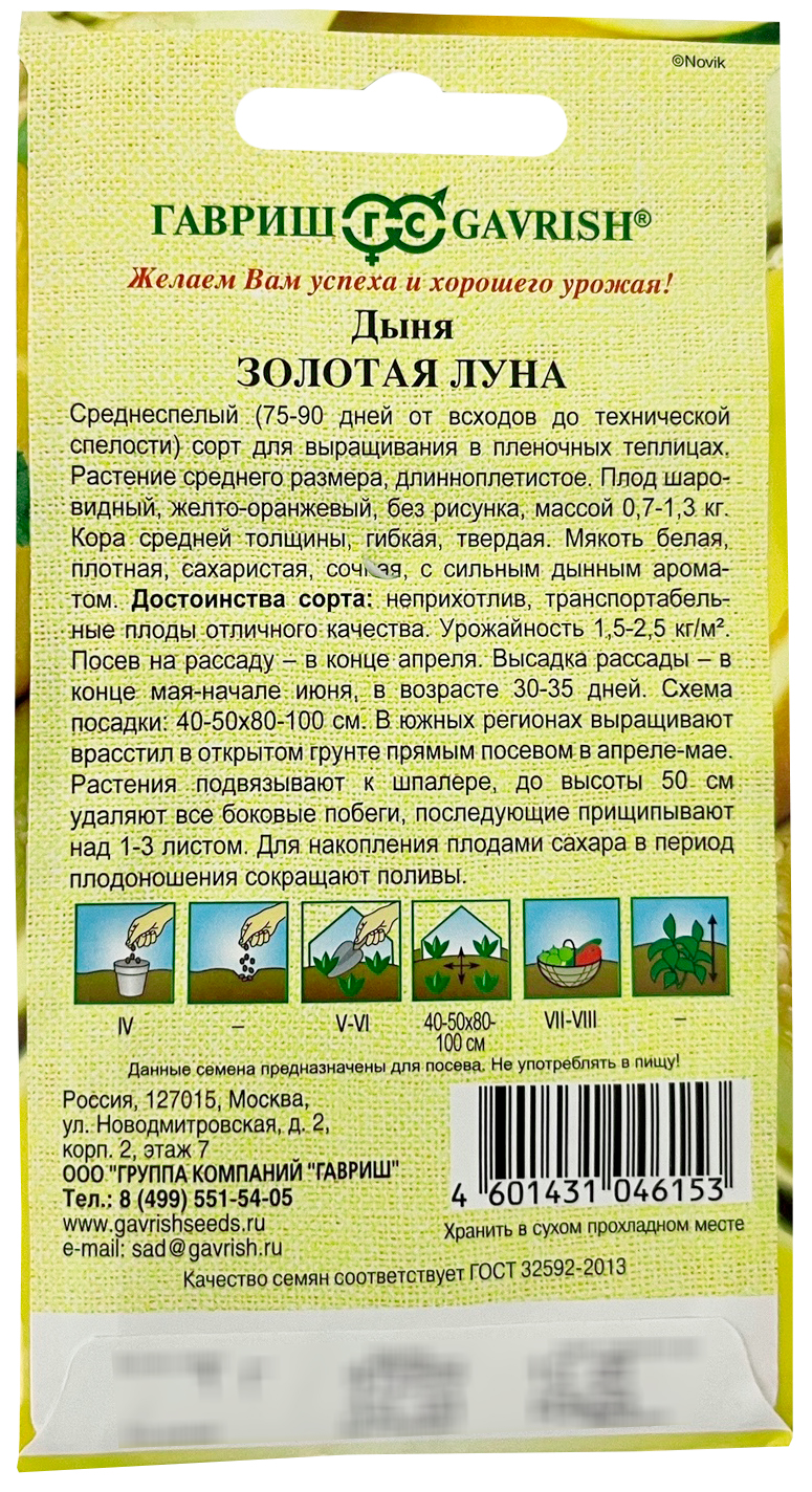 Дыня Золотая лунаСреднеспелый (75-90 дней от всходов до технической спелости) сорт. Растение среднего размера, длинноплетистое. Плод шаровидный, желто-оранжевый, без рисунка, массой 0,7-1,3 кг. Кора средней толщины, гибкая, твердая. Мякоть белая, плотная, сахаристая, сочная, с сильным дынным ароматом. Достоинства сорта: неприхотлив, транспортабельные плоды отличного качества. Урожайность 1,5-2,5 кг/м?. Посев на рассаду – в конце апреля. Высадка рассады в конце мая – начале июня в возрасте 30-35 дней. Схема посадки 40-50х80-100 см. В южных регионах выращивают врасстил в открытом грунте прямым посевом в апреле-мае. Растения подвязывают к шпалере, до высоты 50 см удаляют все боковые побеги, последующие прищипывают над 1-3 листом. Для накопления плодами сахара в период плодоношения сокращают поливы.
