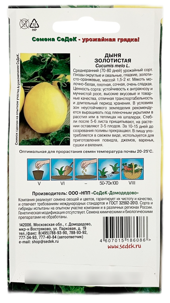 Дыня Золотистая СеДеКСреднеранний (70-80 дней) урожайный сорт. Плоды округлые и овальные, гладкие, золотисто-оранжевые, массой 1,5-2 кг. Мякоть молочно-белая, плотная, сочная, очень сладкая. Ценность сорта: устойчивость к антракнозу и мучнистой росе, высокие вкусовые и товарные качества, отличная транспортабельность и длительный период хранения. В условиях зон неустойчивого земледелия рекомендуется выращивать под пленочным укрытием в расстил или в теплицах на шпалерах. Стебли после 5-6 листа прищипывают, на растении оставляют 3-5 плодов. За 10-15 дней до созревания поливы прекращают. В пищу употребляется в свежем виде, используется для приготовления повидла, джемов, варенья, сушки и вяления.