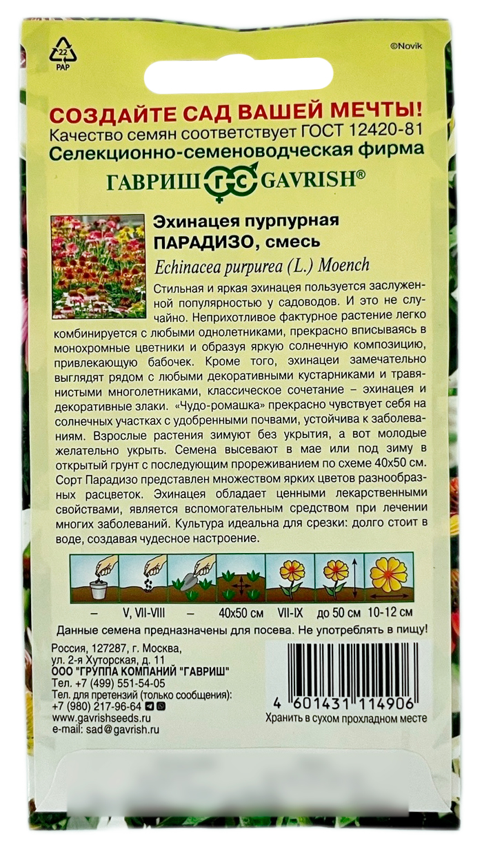 Эхинацея пурпурная Парадизо, смесь ГАВРИШСтильная и яркая эхинацея пользуется заслуженной популярностью у садоводов. И это не случайно. Неприхотливое, фактурное растение легко комбинируется с любыми однолетниками, прекрасно вписываясь в монохромные цветники и образуя яркую солнечную композицию, привлекающую бабочек. Кроме того, эхинацеи замечательно выглядят рядом с любыми декоративными кустарниками и травянистыми многолетниками, классическое сочетание – эхинацеи и декоративные злаки. «Чудо-ромашка» прекрасно чувствует себя на солнечных участках с удобренными почвами, устойчива к заболеваниям. Взрослые растения зимуют без укрытия, а вот молодые желательно укрыть. Семена высевают в мае или под зиму в открытый грунт с последующим прореживанием по схеме 40х50 см. Сорт Парадизо представлен множеством ярких цветов разнообразных расцветок. Эхинацея обладает ценными лекарственными свойствами, является вспомогательным средством при лечении многих заболеваний. Культура идеальна для срезки: долго стоит в воде, создавая чудесное настроение.