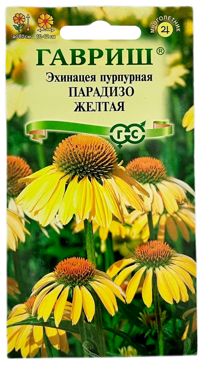 Эхинацея пурпурная Парадизо желтая ГАВРИШСтильная и яркая эхинацея пользуется заслуженной популярностью у садоводов. И это не случайно. Неприхотливое, фактурное растение легко комбинируется с любыми однолетниками, прекрасно вписываясь в монохромные цветники и образуя яркую солнечную композицию, привлекающую бабочек. Кроме того, эхинацеи замечательно выглядят рядом с любыми декоративными кустарниками и травянистыми многолетниками, классическое сочетание – эхинацеи и декоративные злаки. «Чудо-ромашка» прекрасно чувствует себя на солнечных участках с удобренными почвами, устойчива к заболеваниям. Взрослые растения зимуют без укрытия, а вот молодые желательно укрыть. Семена высевают в мае или под зиму в открытый грунт с последующим прореживанием по схеме 40х50 см. Сорт Парадизо представлен множеством ярких цветов от нежной кремово-желтой до сочной лимонной окраски. Эхинацея обладает ценными лекарственными свойствами, является вспомогательным средством при лечении многих заболеваний. Культура идеальна для срезки: долго стоит в воде, создавая чудесное настроение.