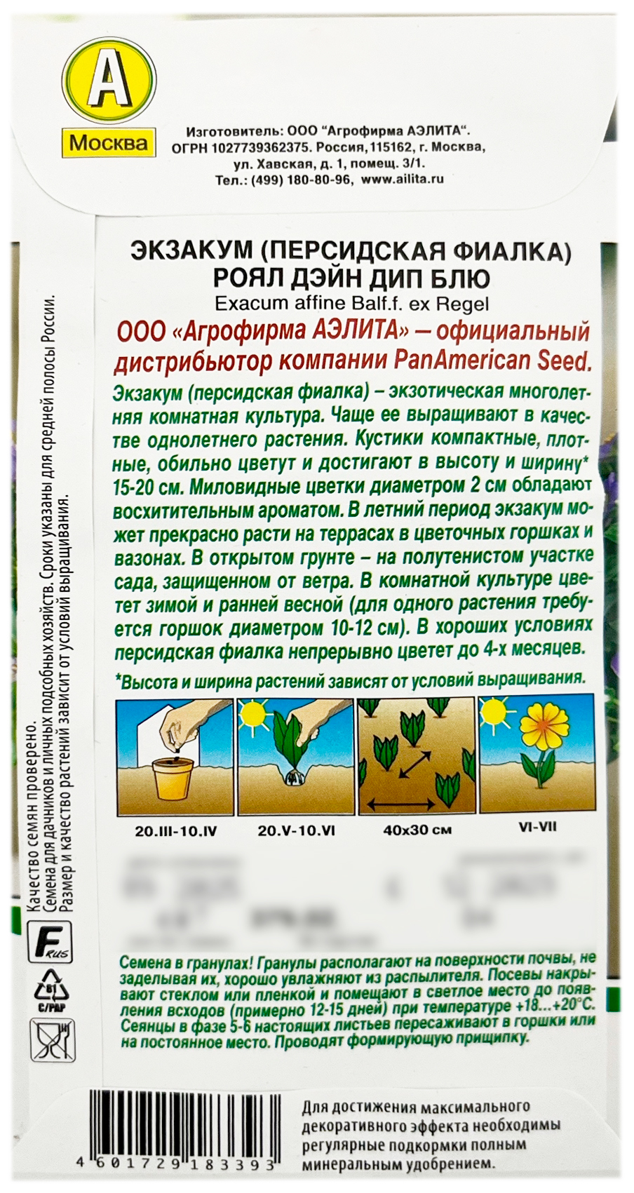 Экзакум персидская фиалка РОЯЛ ДЭЙН ДИП БЛЮ АЭЛИТАЭкзакум (персидская фиалка) – экзотическая многолетняя комнатная культура. Чаще ее выращивают в качестве однолетнего растения. Кустики компактные, плотные, обильно цветут и достигают в высоту и ширину* 15-20 см. Миловидные цветки диаметром 2 см обладают восхитительным ароматом. В летний период экзакум может прекрасно расти на террасах в цветочных горшках и вазонах. В открытом грунте – в защищенном от ветра полутенистом участке сада. В комнатной культуре цветет зимой и ранней весной (для одного растения требуется горшок диаметром 10-12 см). В хороших условиях персидская фиалка непрерывно цветет до 4-х месяцев.