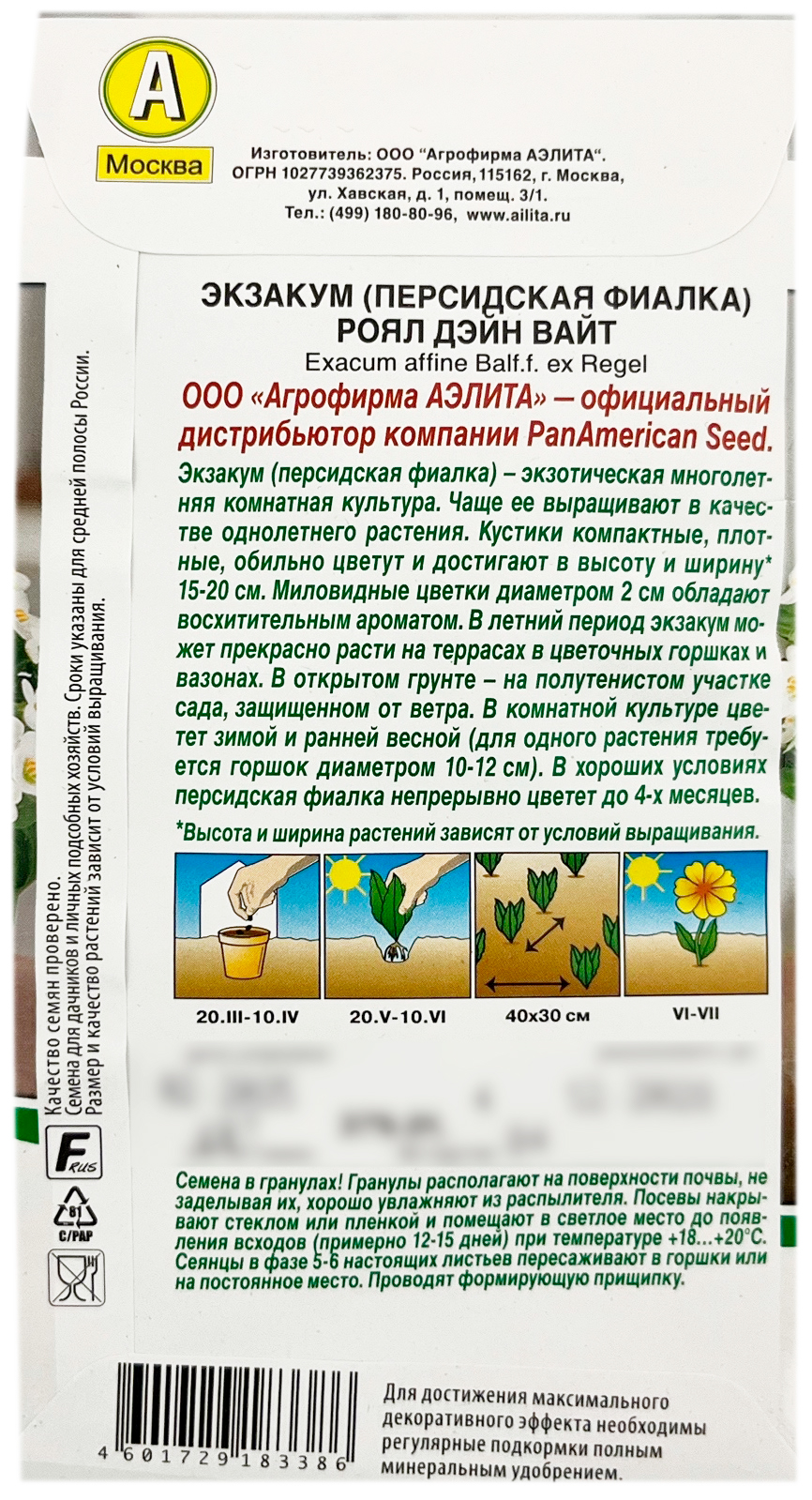 Экзакум персидская фиалка РОЯЛ ДЭЙН ВАЙТ АЭЛИТАЭкзакум (персидская фиалка) – экзотическая многолетняя комнатная культура. Чаще ее выращивают в качестве однолетнего растения. Кустики компактные, плотные, обильно цветут и достигают в высоту и ширину* 15-20 см. Миловидные цветки диаметром 2 см обладают восхитительным ароматом. В летний период экзакум может прекрасно расти на террасах в цветочных горшках и вазонах. В открытом грунте – в защищенном от ветра полутенистом участке сада. В комнатной культуре цветет зимой и ранней весной (для одного растения требуется горшок диаметром 10-12 см). В хороших условиях персидская фиалка непрерывно цветет до 4-х месяцев.