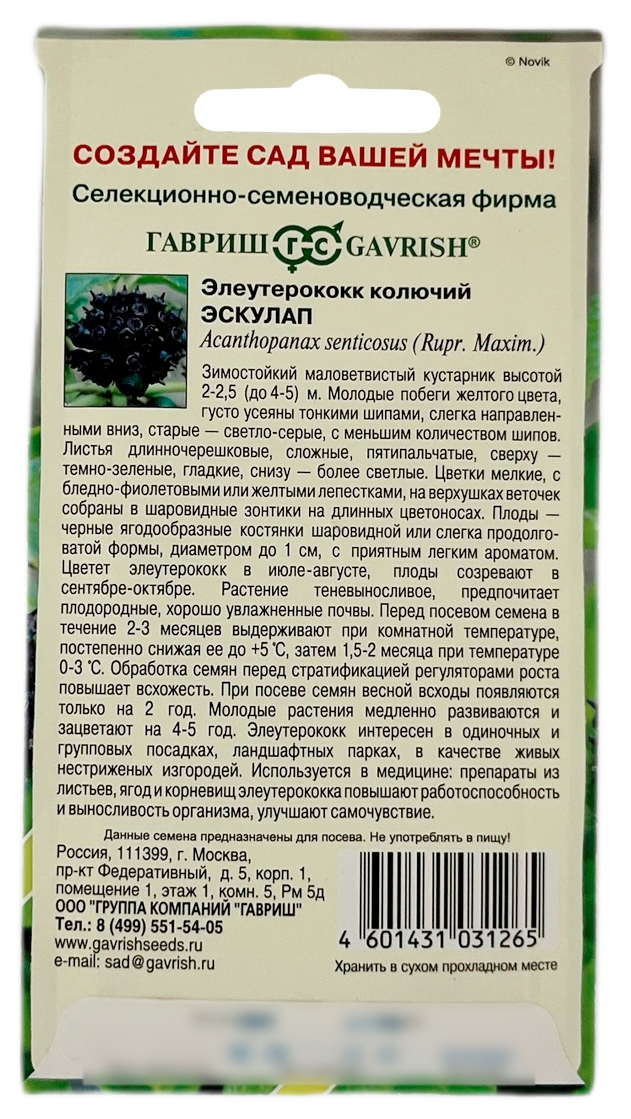 Элеутерококк колючий ЭСКУЛАП ГАВРИШЗимостойкий маловетвистый кустарник высотой 2-2,5 м (до 4-5 м). Молодые побеги желтого цвета, густо усеяны тонкими шипами, слегка направленными вниз, старые - светло-серые с меньшим количеством шипов. Листья длинночерешковые, сложные пятипальчатые, сверху темно-зеленые, гладкие, снизу более светлые. Цветки мелкие, с бледно-фиолетовыми или желтыми лепестками, на верхушках веточек собраны в шаровидные зонтики на длинных цветоносах. Плоды - черные, ягодообразные костянки, шаровидной или слегка продолговатой формы, диаметром до 1 см, с приятным легким ароматом. Цветет элеутерококк в июле - августе, плоды созревают в сентябре-октябре. Растение теневыносливое, предпочитает плодородные, хорошо увлажненные почвы.