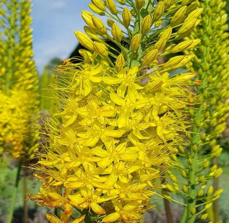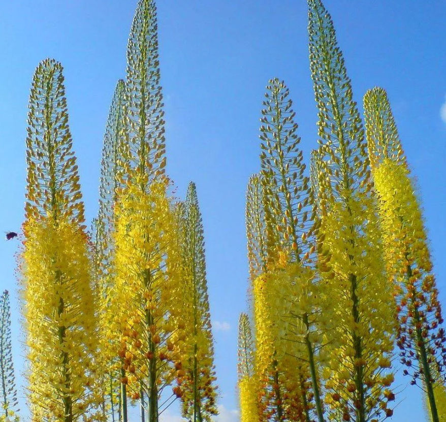 Эремурус Бунге (Bungei) относится к семейству лилейные, особое отличие эремурус в гигантских ярких колосьях. Эремурус Бенге царственный и необыкновенно зрелищный цветок, приковывающий к себе внимание благодаря эффектному цветоносу похожему на вытянутую стрелу высотою до 1,5 м, а то и с человеческий рост. Большую часть цветоноса занимают соцветия с густо усыпанными до 100 звездчатыми цветками ярко-желтого оттенка с удлиненными тычинками. Период цветения приходится на апрель-июль, продолжительность цветения 15-20 дней. Аромат тонкий, приятный, листья прикорневые, линейные, темно-зеленые, цветонос прочный, не требует опоры. Эремурус Бунге очень капризное растение, предпочитает солнечные места, выносит слегка затененные, требует хорошо дренированную почву. Время посадки приходится на сентябрь-ноябрь, в зависимости от региона высадки. Глубина посадки10-15 см, расстояние между растениями 30-50 см. Размножается Эремурус семенами или корнедонцами. На зиму растение укрывают торфом, или небольшим слоем листвы.Характеристики