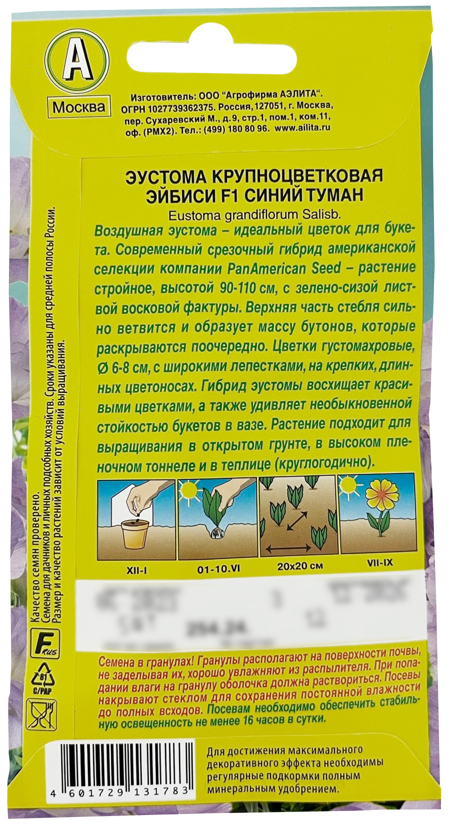 Эустома Эйбиси F1 синий туман крупноцветковая махровая 5штВоздушная эустома – идеальный цветок для букета. Современный срезочный гибрид американской селекции – растение стройное, высотой 90-110 см, с зелено-сизой листвой восковой фактуры. Верхняя часть стебля сильно ветвится и образует массу бутонов, которые раскрываются поочередно. Цветки густомахровые, Ø 6-8 см, с широкими лепестками, на крепких, длинных цветоносах. Гибрид эустомы восхищает красивыми цветками, а также удивляет необыкновенной стойкостью букетов в вазе. Растение подходит для выращивания в открытом грунте, в высоком пленочном тоннеле и в теплице (круглогодично).