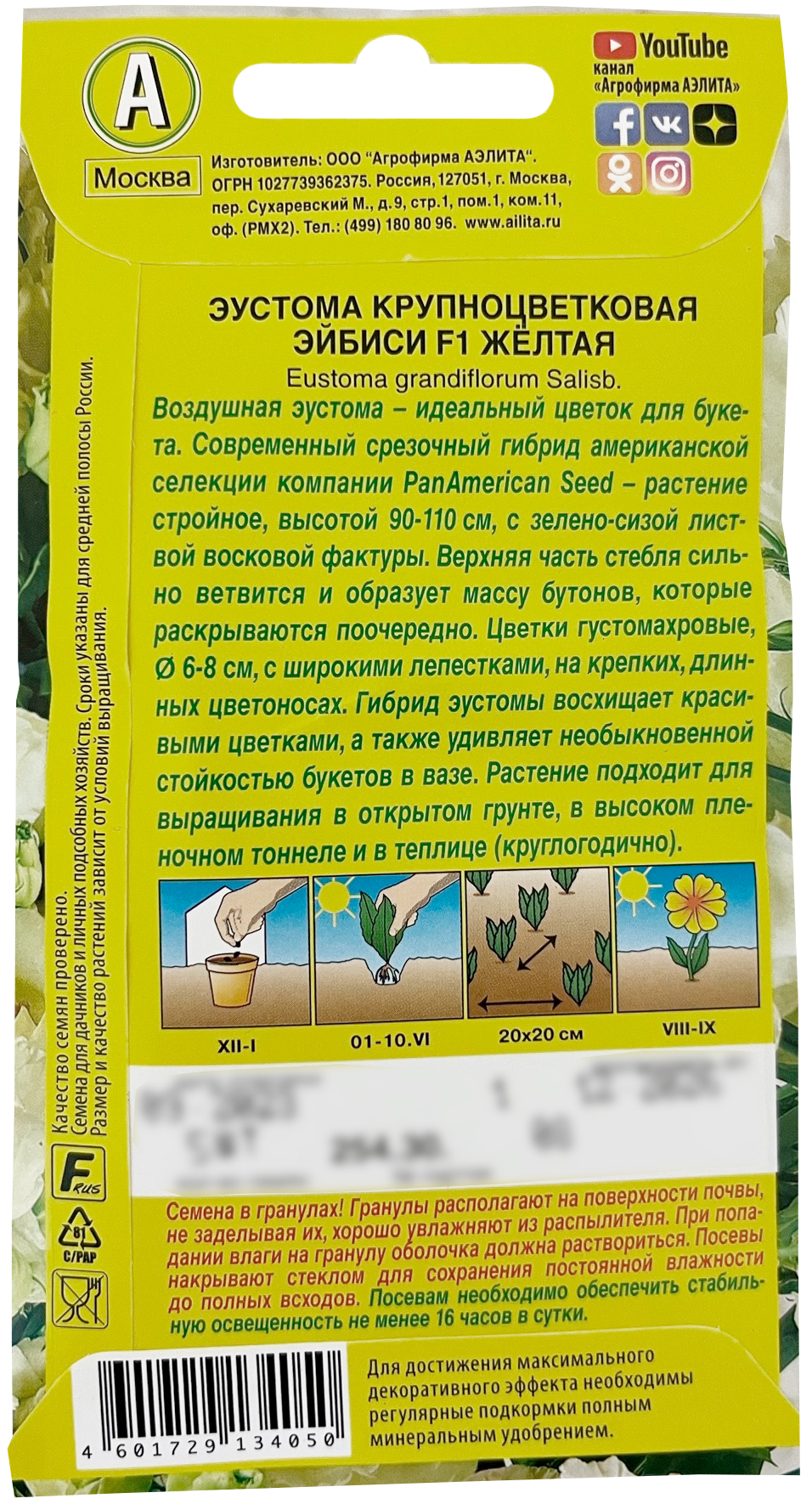 Эустома Эйбиси F1 желтая крупноцветковая махровая 5штВоздушная эустома - идеальный цветок для букета невесты. Современный срезочный гибрид американской селекции - растение стройное, высотой 90-110 см, с зеленосизой листвой восковой фактуры. Верхняя часть стебля сильно ветвится и образует массу бутонов, которые раскрываются поочередно. Цветки густомахровые, диаметром 6-8 см, с широкими лепестками, на крепких, длинных цветоносах. Гибрид Эустомы восхищает красивыми цветками, а также удивляет необыкновенной стойкостью букетов в вазе. Растение подходит для выращивания в открытом грунте, в высоком пленочном тоннеле и в теплице (круглогодично).