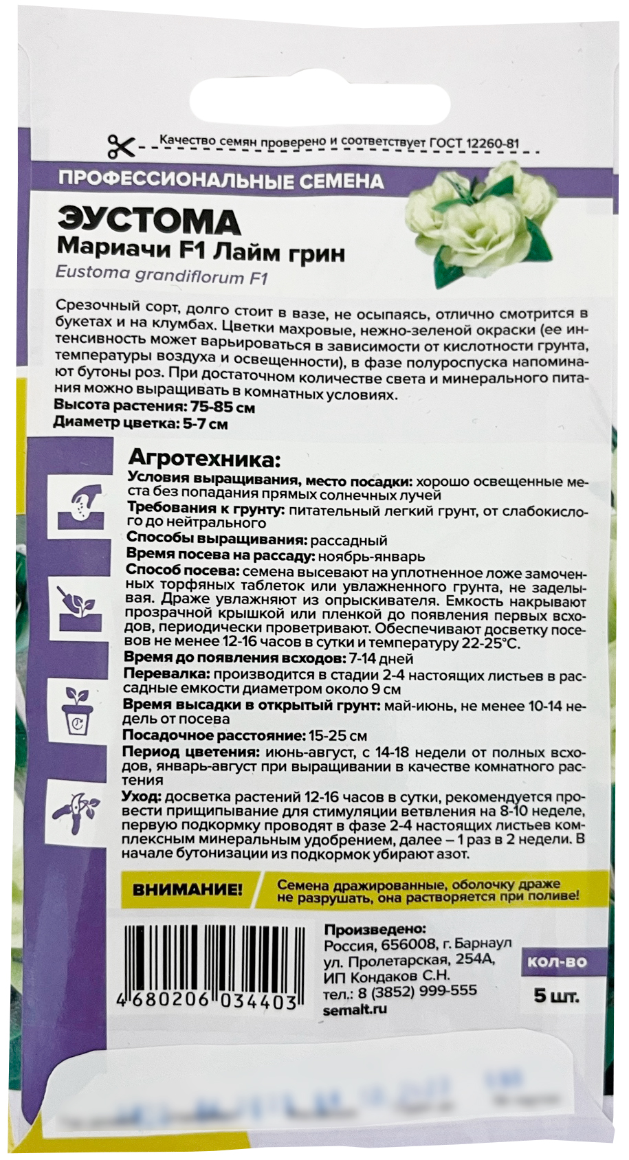 Эустома Мариачи Лайм Грин F1 5штСрезочный сорт, долго стоит в вазе, не осыпаясь, отлично смотрится в букетах и на клумбах. Цветки махровые, нежно-зеленой окраски ( ее интенсивность может варьироваться в зависимости от кислотности грунта, температуры воздуха и освещенности), в фазе полуроспуска напоминают бутоны роз. При достаточном количестве света и минерального питания можно выращивать в комнатных условиях.