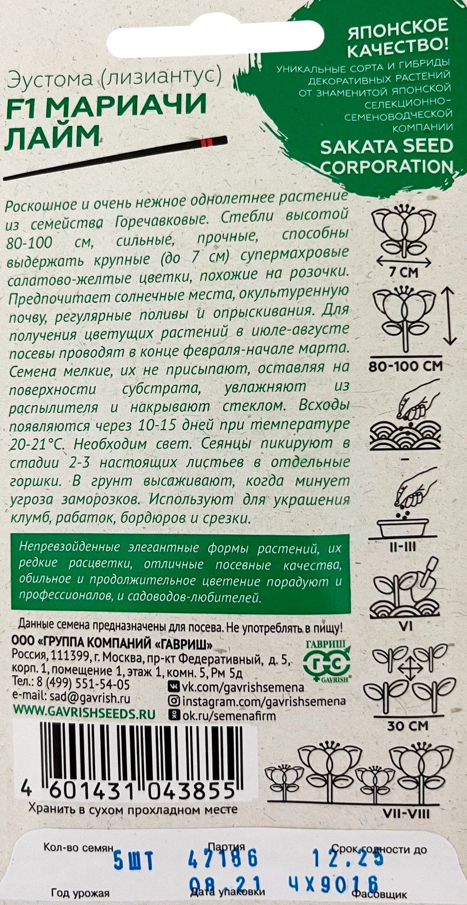Эустома Мариачи лайм F1, махровая, 4 шт. гранул. пробирка, Саката серия ЭксклюзивРоскошное и очень нежное однолетнее растение из семейства Горечавковые. Стебли высотой 80-100 см, сильные, прочные, способные выдержать крупные (до 7 см), супермахровые салатово-желтые цветки похожие на розочки. Предпочитает солнечные места, окультуренную почву, регулярные поливы и опрыскивания. Для получения цветущих растений в июле — августе посевы производят в конце февраля — начале марта. Семена мелкие, их не присыпают, оставляя на поверхности субстрата, увлажняют из распылителя и накрывают стеклом. Всходы появляются через 10-15 дней при температуре +20-21оС. Необходим свет. Сеянцы пикируют в стадии 2-3-х настоящих листьев в отдельные горшки. В грунт высаживают, когда минует угроза заморозков. Используют для украшения клумб, рабаток, бордюров и срезки.