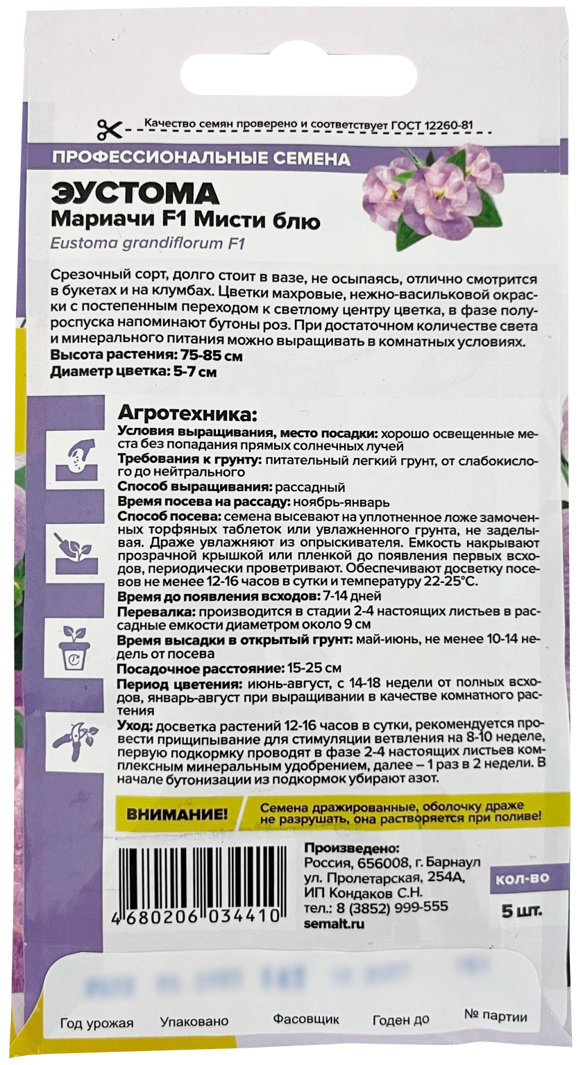 Эустома Мариачи Мисти Блю F1 5штСрезочный сорт, долго стоит в вазе, не осыпаясь, отлично смотрится в букетах и на клумбах. Цветки махровые, нежно-васильковой окраски с постепенным переходом к светлому центру цветка, в фазе полуроспуска напоминают бутоны роз. При достаточном количестве света и минерального питания можно выращивать в комнатных условиях.