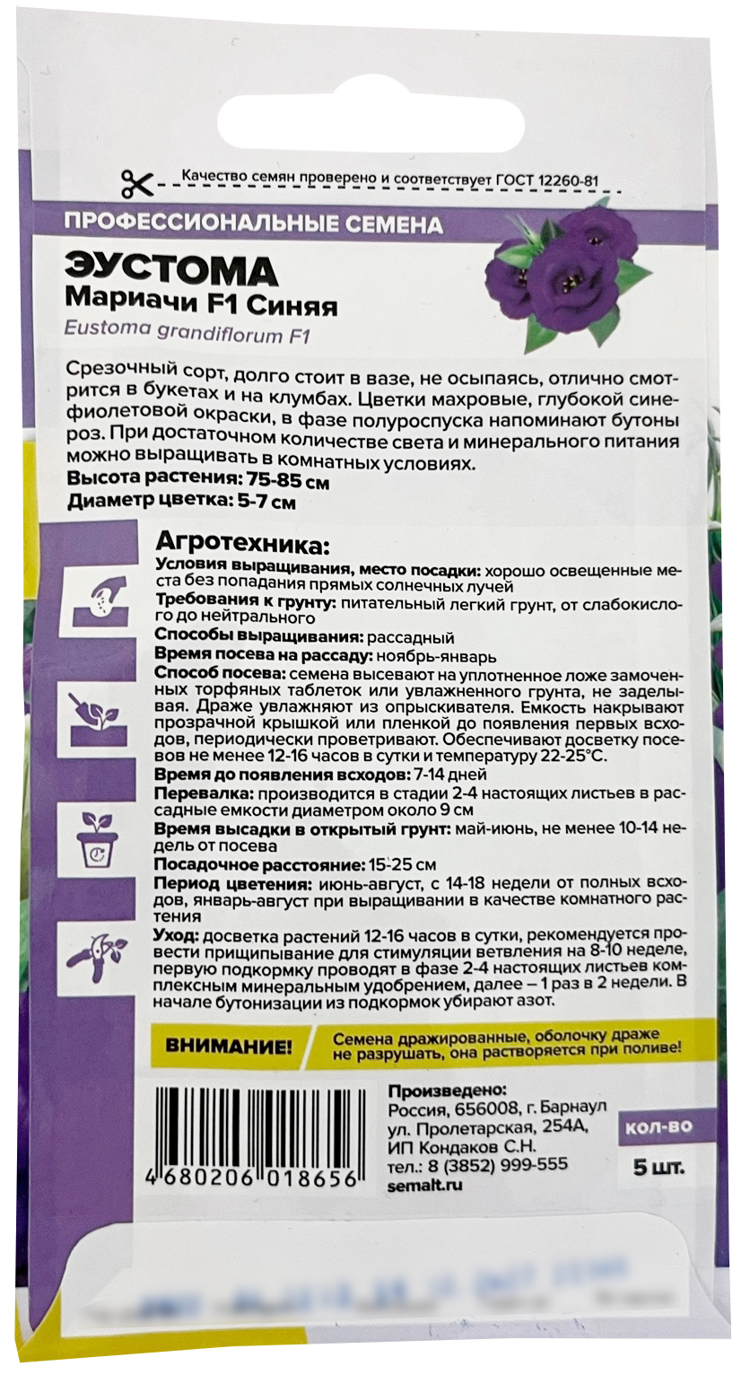 Эустома Мариачи Синяя F1Срезочный сорт, долго стоит в вазе, не осыпаясь, отлично смотрится в букетах и на клумбах. Цветки махровые, глубокой сине-фиолетовой окраски, в фазе полуроспуска напоминают бутоны роз. При достаточном количестве света и минерального питания можно выращивать в комнатных условиях.