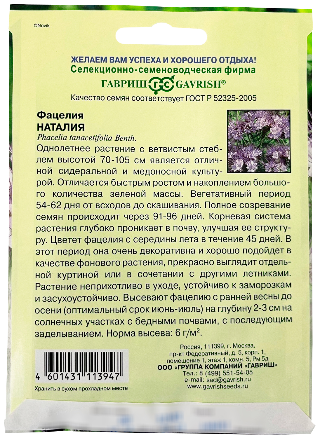 Фацелия Наталия ГАВРИШОднолетнее растение с ветвистым стеблем, высотой 70-105 см, является отличной сидеральной и медоносной культурой. Отличается быстрым ростом и накоплением большого количества зеленой массы. Вегетативный период 54-62 дня от всходов до скашивания. Полное созревание семян происходит через 91-96 дней. Корневая система растения глубоко проникает в почву, улучшая ее структуру. Цветет фацелия с середины лета в течение 45 дней. В этот период она очень декоративна и хорошо подойдет в качестве фонового растения, прекрасно выглядит отдельной куртиной или в сочетании с другими летниками. Растение неприхотливо в уходе, устойчиво к заморозкам и засухоустойчиво.