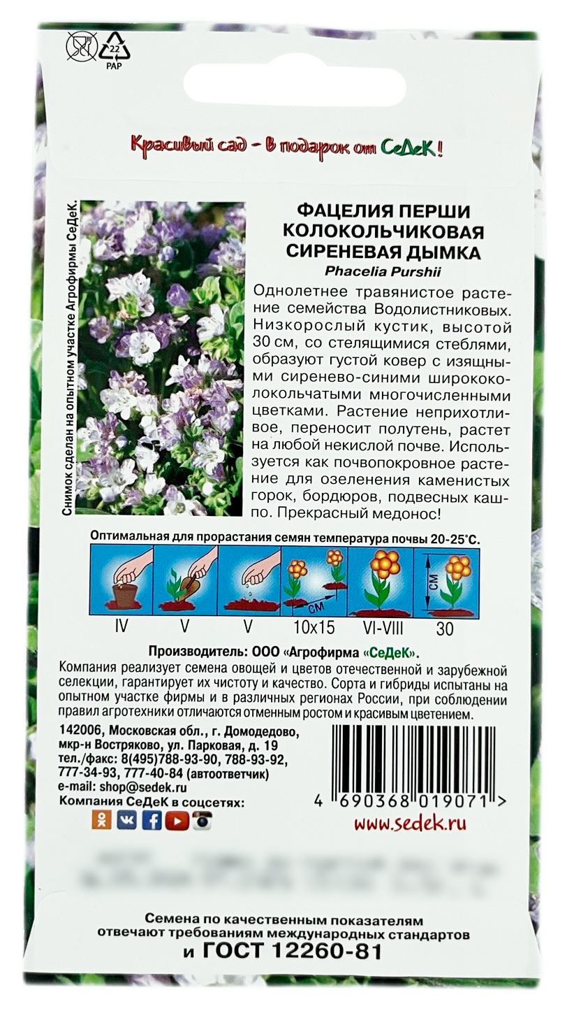 Фацелия перши колокольчиковая СИРЕНЕВАЯ ДЫМКА СеДеКОднолетнее травянистое растение семейства Водолистниковых. Низкорослый кустик, высотой 30 см, со стелящимися стеблями, образуют густой ковер с изящными сиренево-синимиширококолокольчатыми многочисленными цветками. Растение неприхотливое, переносит полутень, растет на любой некислой почве. Используется как почвопокровное растение для озеленения каменистых горок, бордюров, подвесных кашпо. Прекрасный медонос! Оптимальная для прорастания семян температура почвы 20-25°С.