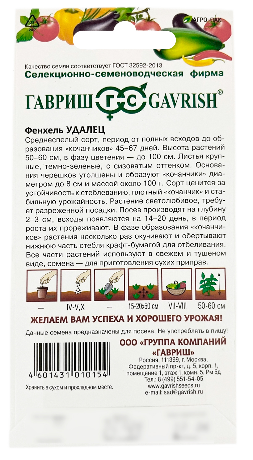 Фенхель овощной Удалец ГАВРИШСреднеспелый. Период от полных всходов до начала технической спелости (образование "кочанчика") 50-70 дней. Растение высотой 55-60 см. Стебель прямостоячий, высокорослый, зеленый, сильноветвистый. "Кочанчик" белый, плотный. Масса "кочанчика"- 200-220 г. Урожайность товарной продукции 1,1-1,2 кг/м2. Выращивают прямым посевом в грунт в конце апреля – начале мая. Предпочитает рыхлые, питательные почвы. Уход заключается в регулярных прополках, рыхлениях, поливах и подкормках комплексными минеральными удобрениями. Схема посева - в ряду между растениями 7-10 см, между рядами 15-20 см. Рекомендуется для использования зелени в свежем и сушеном виде как пряно-вкусовая добавка к супам, мясным блюдам и овощам. В пищу используют также отварные "кочанчики", листья, побеги и корни, семена добавляют при консервировании овощей.