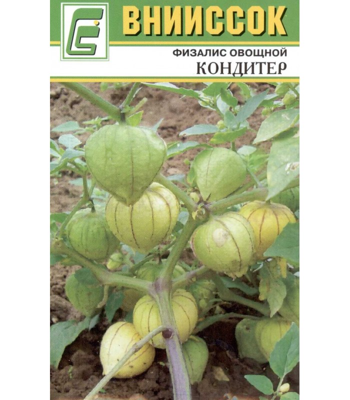Физалис овощной КондитерРаннеспелый сорт. От всходов до созревания плодов 80-90 суток. Растение полустоячее, хорошо ветвящееся. Плод — многосемянная мясистая ягода. Плоды от округло-плоской до округлой формы, диаметром 30-55 мм и массой 50-80 г (единичные до 100 г). Окраска незрелого плода светло-зелёная, зрелых — от жёлтой до янтарной. Вкус зрелых плодов приятный кисло-сладкий. Плоды созревают поочерёдно. Они пригодны для переработки, приготовления кулинарных и кондитерских изделий, солений, маринадов и икры.