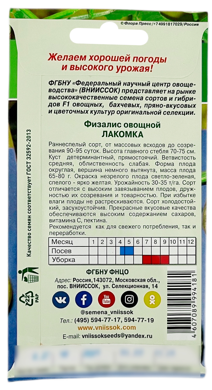 Физалис овощной ЛАКОМКА ВНИИССОКДля выращивании в открытом грунте в ЛПХ. Вид physalis fngulata. Рекомендуется для использования в свежем виде, консервирования, засолки, приготовления варенья, цукатов. Сорт раннеспелый.
