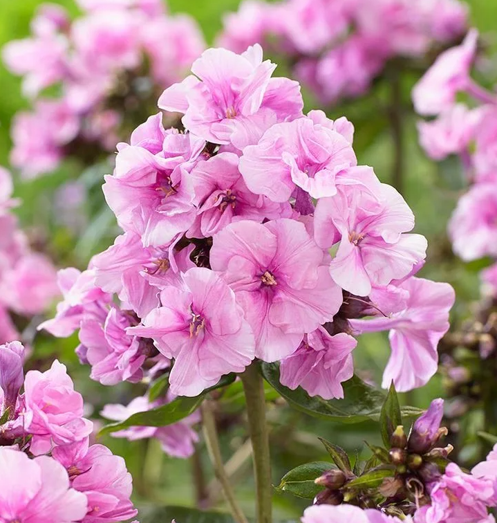 Отличный подарок для ценителей флоксов! Сорт с уникальными цветками. Розовые лепестки с малиновым глазком, постепенно раскрываясь, превращаются в оригинальный цветок. Края лепестков изгибаются в разных направлениях, а цветок кажется объемнее и пышнее. Приглядевшись, можно разглядеть в центре еще один ряд не до конца раскрывшихся лепестков. Скрученные цветки 3 см в диаметре переливаются на солнце разнообразными оттенками от белого до насыщенного розового. Пышными соцветиями можно любоваться уже с июня!Высота: 75 см;