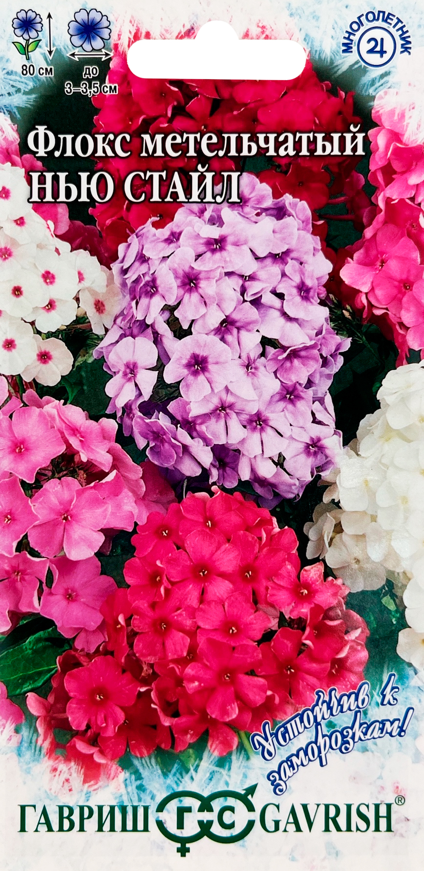 Флокс Нью Стайл, метельчатый смесьМноголетнее прямостоячее кустистое растение из семейства Синюховые, высотой 80 см. Обильно и продолжительно цветет с июля по сентябрь. Цветки пятилепестковые, душистые, диаметром до 5 см, собраны в крупные метельчатые соцветия белого, лилово-розового, розового и пурпурного цвета. Растение светолюбивое, но выносит и полутень. Хорошо растет на плодородных суглинистых почвах. Зимостойкое, в малоснежные зимы может подмерзать. Озывчиво на частый полив, так как имеет поверхностную корневую систему. Семена высевают в открытый грунт поздней осенью или весной после промораживания (выдерживание сухих семян в морозильной камере) в течение 1-2 недель. После появления 3-4 пар настоящих листьев сеянцы рассаживают на расстоянии 20 см друг от друга и дважды, с интервалом в 3 недели, подкармливают минеральными и органическими удобрениями. Смесь рекомендуется для оформления миксбордеров любых типов, цветников в стиле кантри и пейзажных композиций.