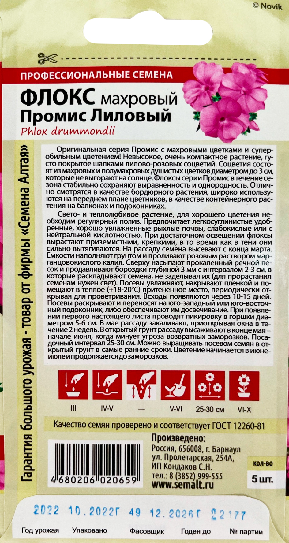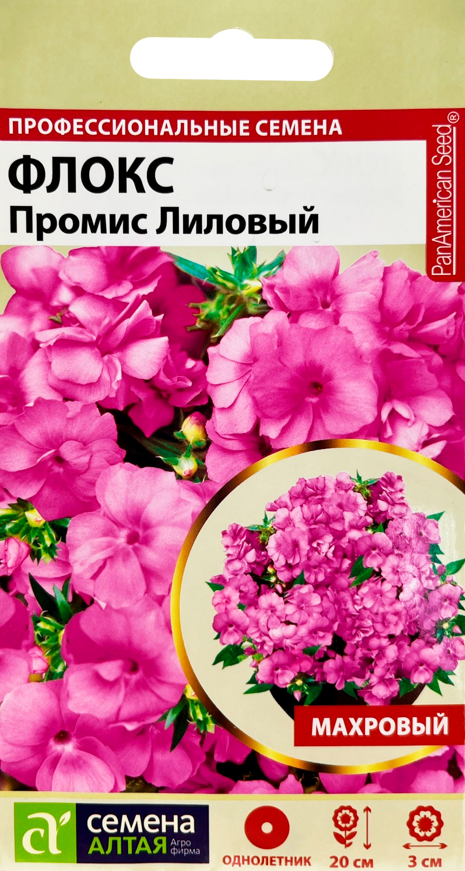Флокс Промис Лиловый махровый 5штОригинальная серия Промис с махровыми цветками и суперобильным цветением! Невысокое, очень компактное растение, густо покрытое шапками лилово-розовых соцветий. Соцветия состоят из махровых и полумахровых душистых цветков диаметром до 3 см, которые не выгорают на солнце. Флоксы серии Промис в течение сезона стабильно сохраняют выравненность и однородность. Отлично смотрятся в качестве бордюрного растения, широко используются на переднем плане цветников, в качестве контейнерного растения на балконах и подоконниках.
