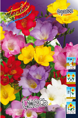 Фрезия Смесь относится к группе многолетних луковичных растений, к семейству ирисовых. Растение с линейными листьями и односторонним кистевидным соцветием, несущим около 12 душистых воронковидных смесь цветков диаметром до 10 см. Высота растения 60 см. Цветение продолжается от двух до трех недель, в июле-августе. Посадка 3-4 штуки на глубину 3 см. Фрезия предпочитает защищенное от ветров, солнечное место. Почва подойдет рыхлая и легкая. Высаживать в участках, где практически нет сквозняков, на зимовку луковицы фрезии оставлять в грунте в саду можно только в том случае, если в ваших краях не бывает морозных зим.Размножаются фрезии: клубнелуковицами, клубнепочками и семенами. Используется в ландшафтном дизайне.Характеристики