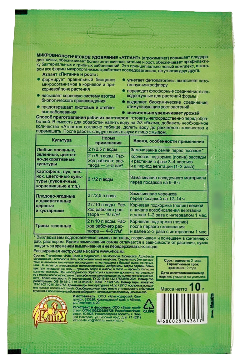 Атлант 10г бактерии-помощникиМИКРОБИОЛОГИЧЕСКОЕ УДОБРЕНИЕ «АТЛАНТ» (агрохимикат) оздоравливает почву, повышает плодородие, искореняет и подавляет вредную патогенную микрофлору, позволяет получить здоровые сильные растения и экологически безопасный, полезный для здоровья урожай. Это принципиально новый комплекс, в котором все формы микроорганизмов работают последовательно, не угнетая друг друга.