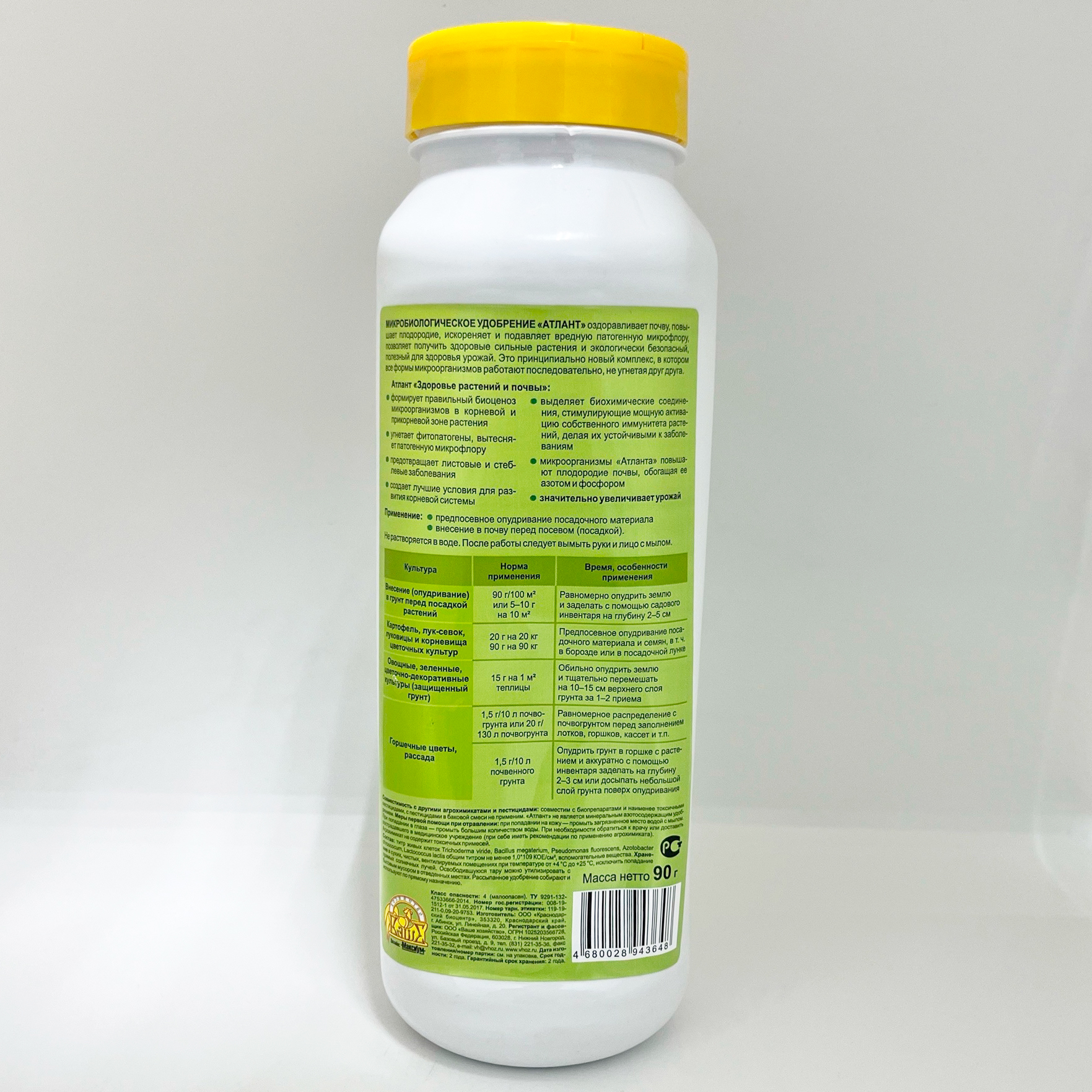 Атлант бактерии-помощники 90гАтлант оздоравливает почву, повышает плодородие, искореняет и подавляет вредную патогенную микрофлору, позволяет получить здоровые сильные растения и экологически безопасный, полезный для здоровья урожай. Это принципиально новый комплекс, в котором все формы микроорганизмов работают последовательно, не угнетая друг друга.