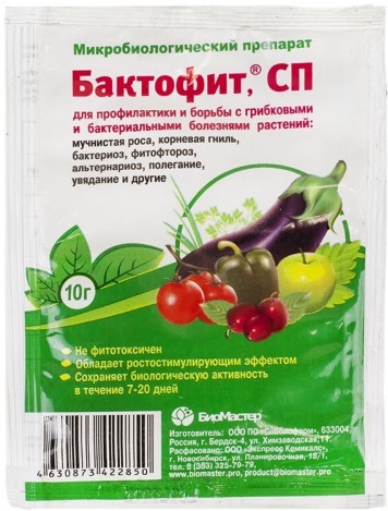 БАКТОФИТ – биологический препарат для борьбы с грибными и бактериальными болезнями зерновых, овощных, плодово-ягодных культур, болезнями цветов и лекарственных растений. Бактофит производится на основе штамма ИПМ-215 культуры Bacillus subtilis и выпускается в виде суспензионного концентрата (СК) и смачивающегося порошка (СП). Препарат сохраняет биологическую активность в почве и на растениях в течение 7-20 дней. Обработку зерновых культур Бактофитом рекомендуется совмещать с химической прополкой посевов гербицидами. При этом Бактофит оказывает на растения антистрессовое действие и повышает урожайность зерновых: с Гепардом и Кортесом - на 20-22%; с Элантом, Элантом Премиум, Эламетом, Октапоном и Терраметом - на 10-15%; с Лограном, Дифезаном, Банвелом и Топиком - на 4-7%.Бактофит предназначен для: