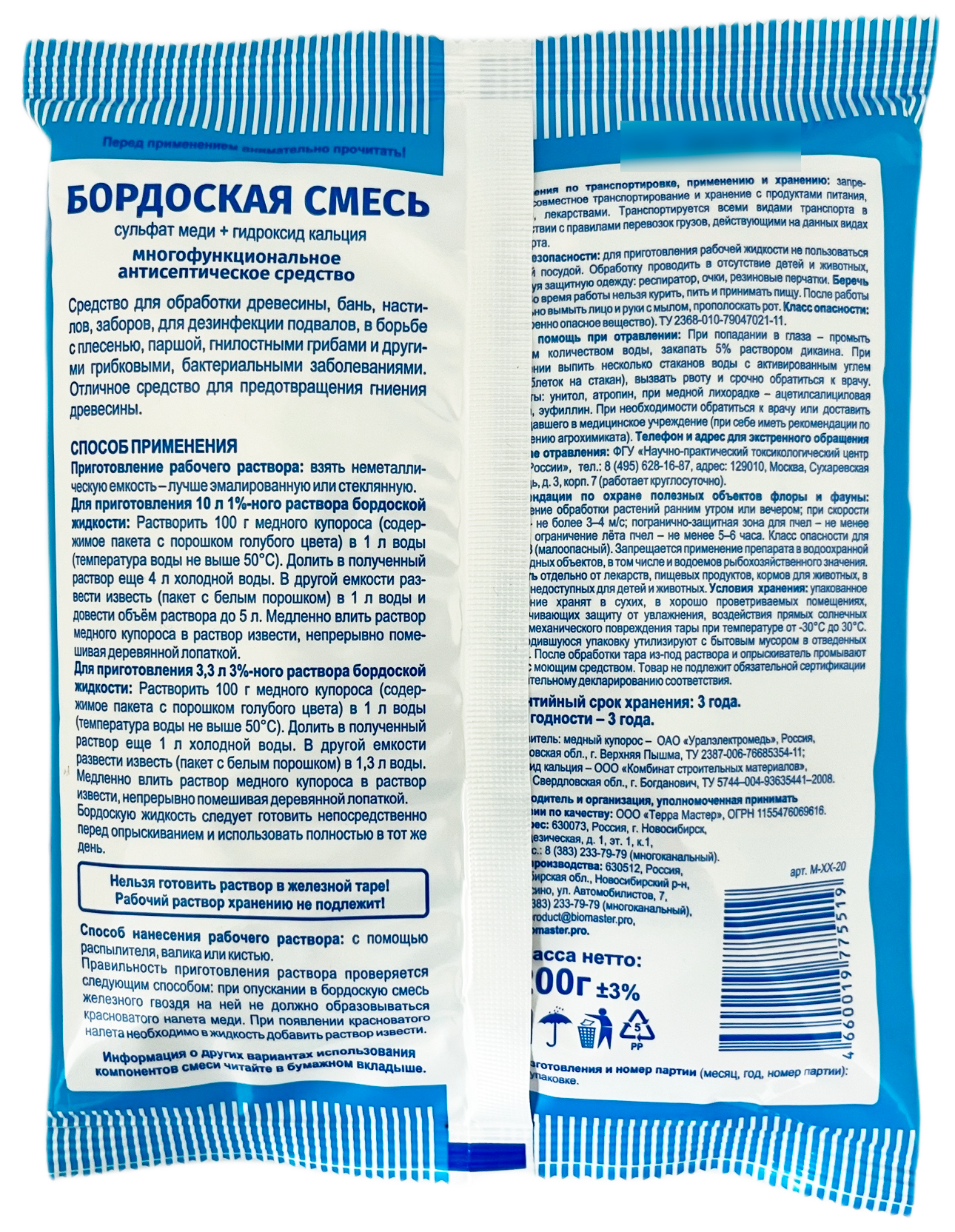 Бордоская смесь, 200г ВырастайкаДля обработки древесины, бань, настилов, заборов и подвалов, а также при ремонтно-строительных работах, для борьбы с плесенью, паршой, гнилостными грибами и другими грибковыми и бактериальными заболеваниями.