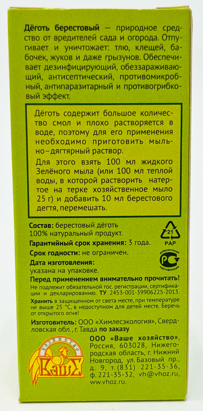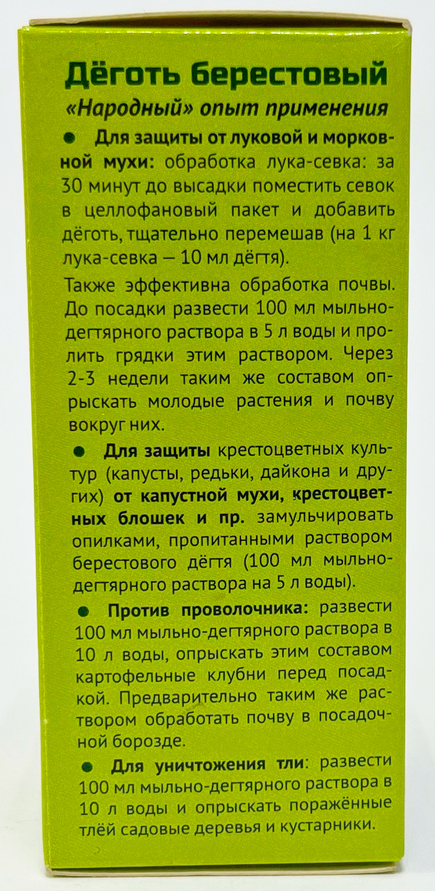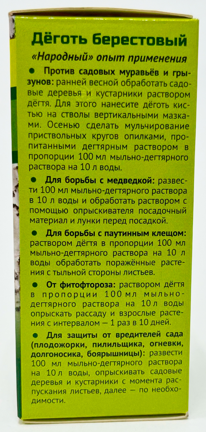 Деготь берестовый Экстра 80млПрименение березового дегтя в саду очень широко. Чаще всего его используют для борьбы с вредоносными насекомыми, такими как колорадский жук, муравьи, проволочник, луковая, капустная муха и множество других.