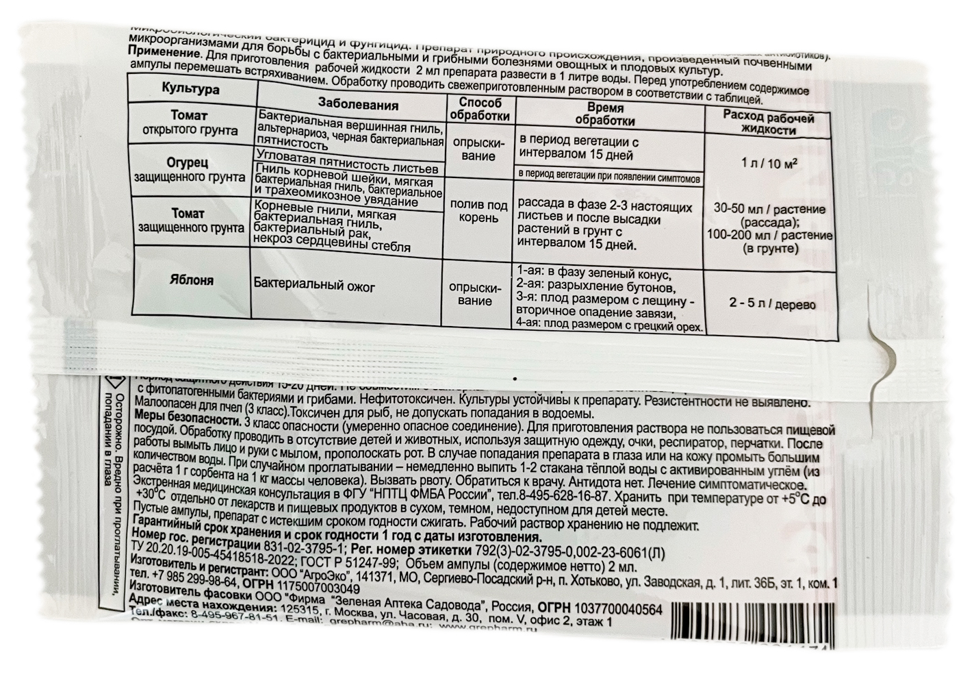 Состав: водорастворимый концентрат с содержанием фитобактериомицина – комплекса стрептотрициновых антибиотиков, продуцируемых почвенными грибами.