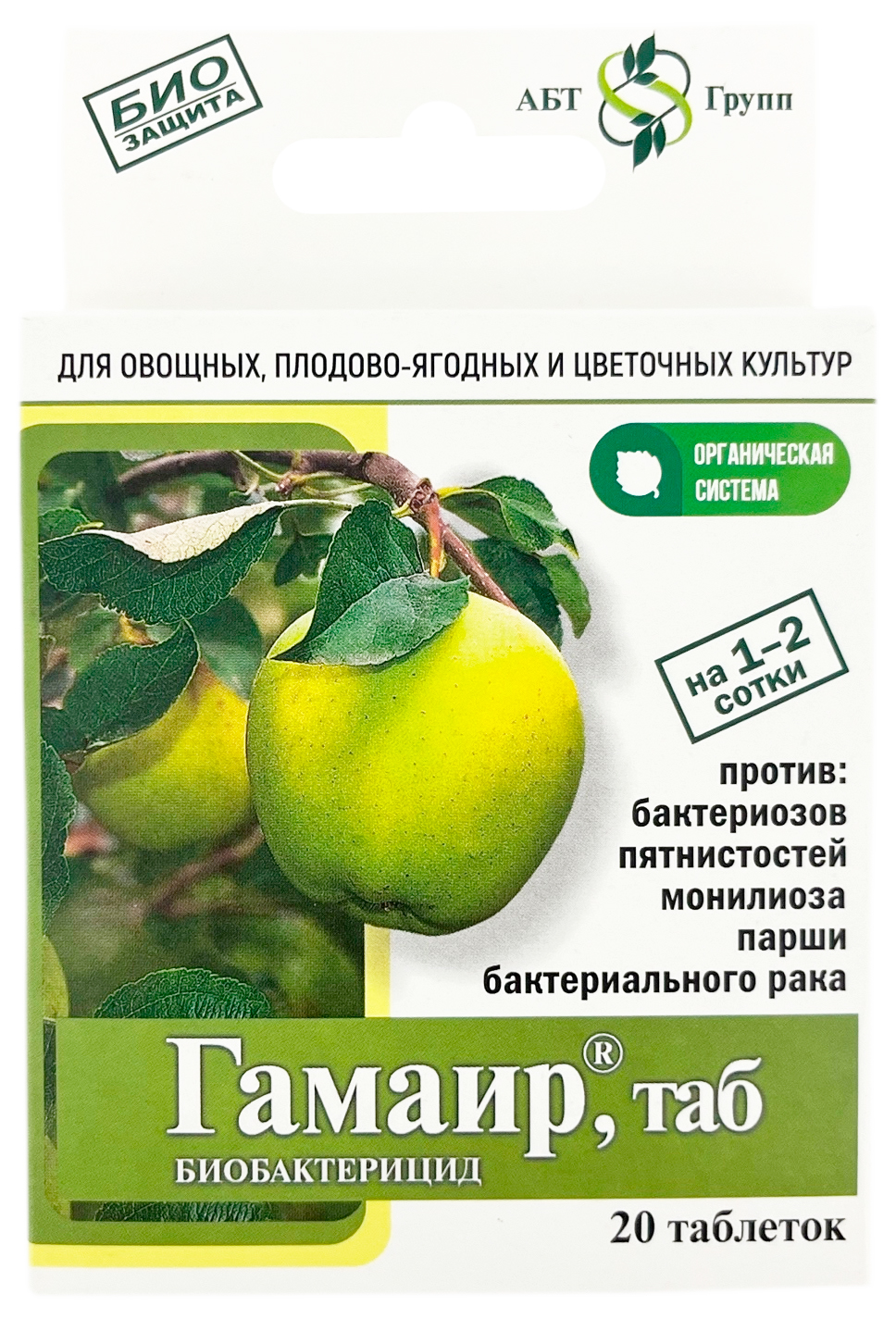 ГАМАИР, 20 таблеток (на 1-2 сотки)Биобактерицид. Для овощных, плодово-ягодных и цветочных культур. Против бактериозов, пятнистостей, монолиоза, парши, бактериального рака.