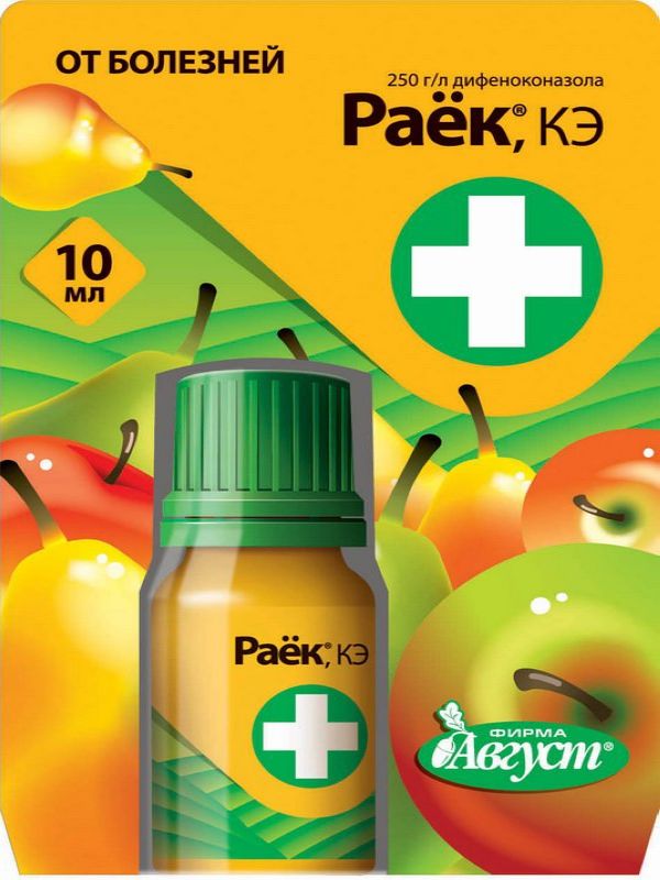Раек является препаратом широкого спектра защиты для растений. Изготовлен на основе дифеноконазола. Этот пестицид принадлежит классу триазолов, уникальных веществ, которые негативно воздействуют на синтез ДНК клеток грибка. Препараты на основе активных компонентов этой группы применялись с середины 70-х готов прошлого столетия и не потеряли популярности по сей день.Характеристики
