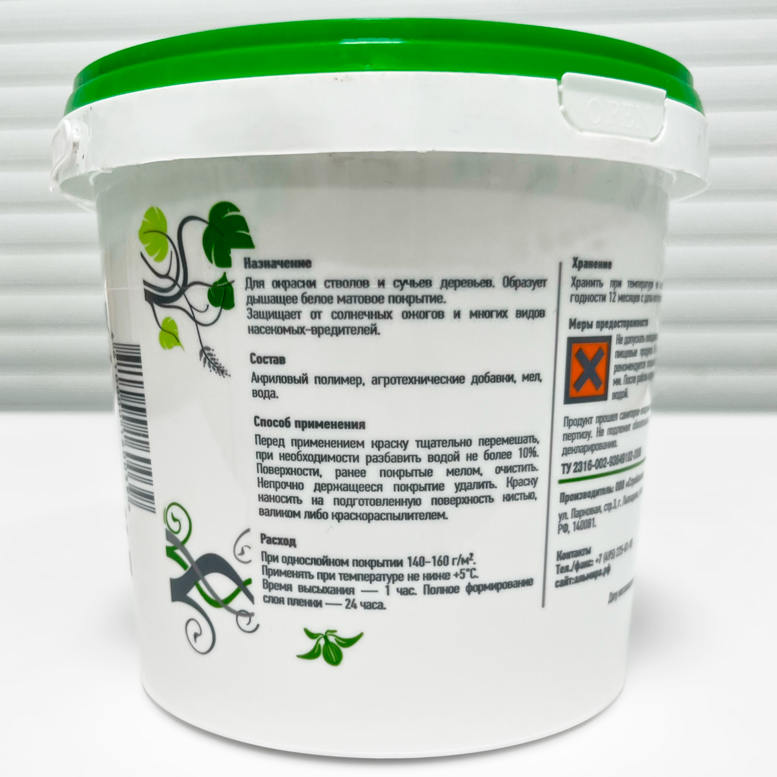Для окраски стволов и сучьев деревьев. Образует дышащее белое матовое покрытие. Защищает от солнечных ожогов и многих видов насекомых-вредителей.