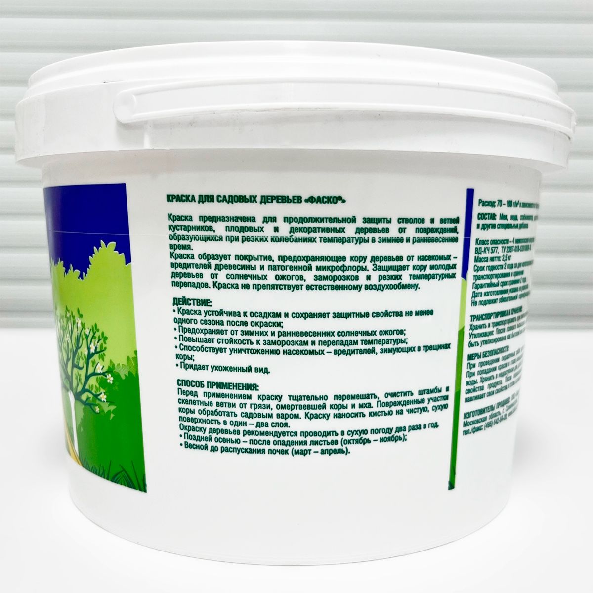 Акриловая краска для садовых деревьев ФАСКО 2,5кгКраска предназначена для продолжительной защиты стволов и ветвей кустарников, плодовых и декоративных деревьев от повреждений, образующихся при резких колебаниях температуры в зимнее и ранневесеннее время.