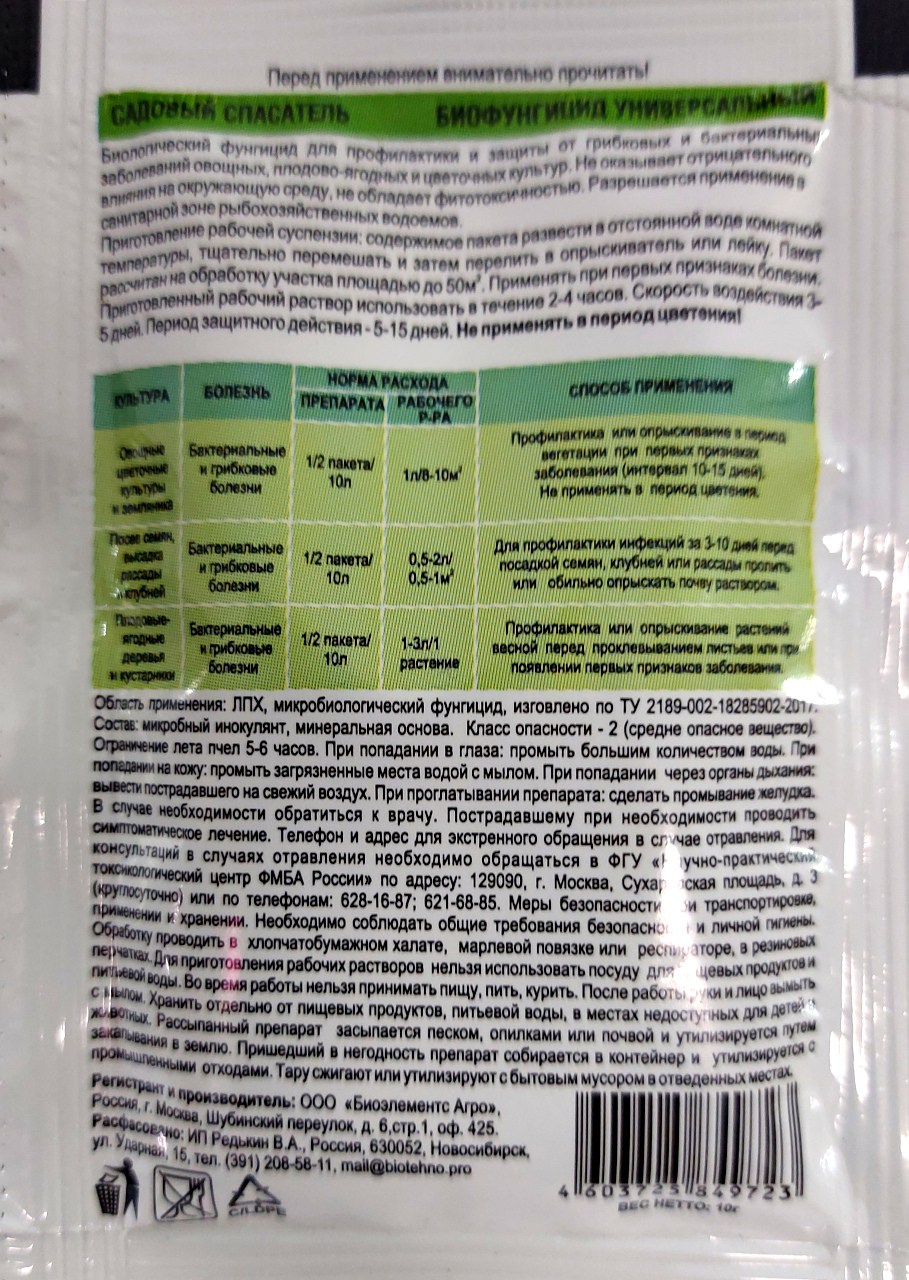 1. Биологический фунгицид для профилактики и защиты от грибковых и бактериальных заболеваний овощных, плодово-ягодных и цветочных культур. Не оказывает отрицательного влияния на окружающую среду, не обладает фитотоксичностью. Разрешается применение в санитарной зоне рыбохозяйственных водоемов.