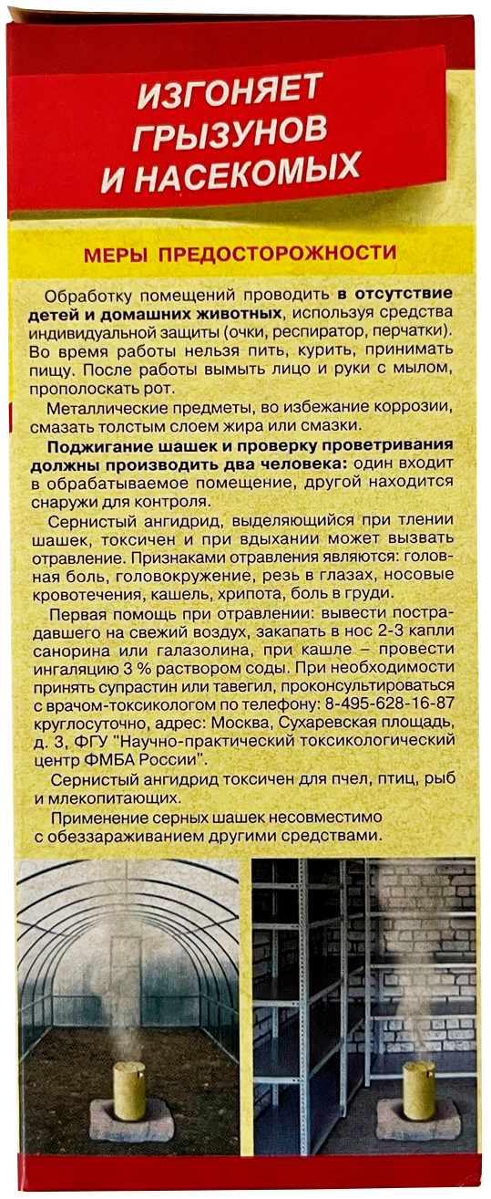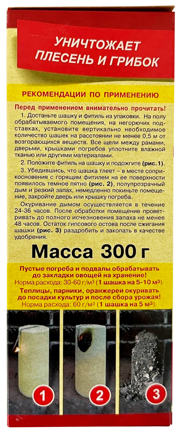 Дымовая серная шашка от светло-серого до желто-коричневого цвета. Препарат предназначен для комплексного обеззараживания, дезинфекции и защиты пустых погребов и подвалов (вне жилых помещений), теплиц, парников, оранжерей от возбудителей грибных и бактериальных болезней, насекомых вредителей и клещей. Изгоняет крыс и мышей. Время тления шашки 60 минут, а период фумигационного действия до 36 часов.