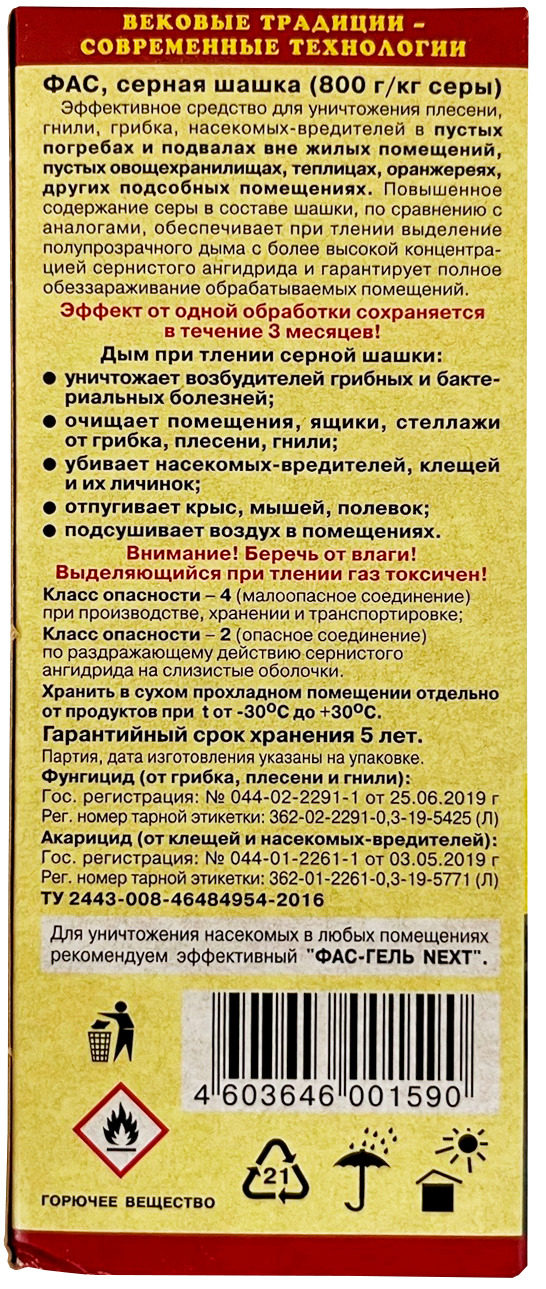 Серная шашка ФАС универсальная 300 г.Сохранит урожай! Для погребов, подвалов, теплиц.