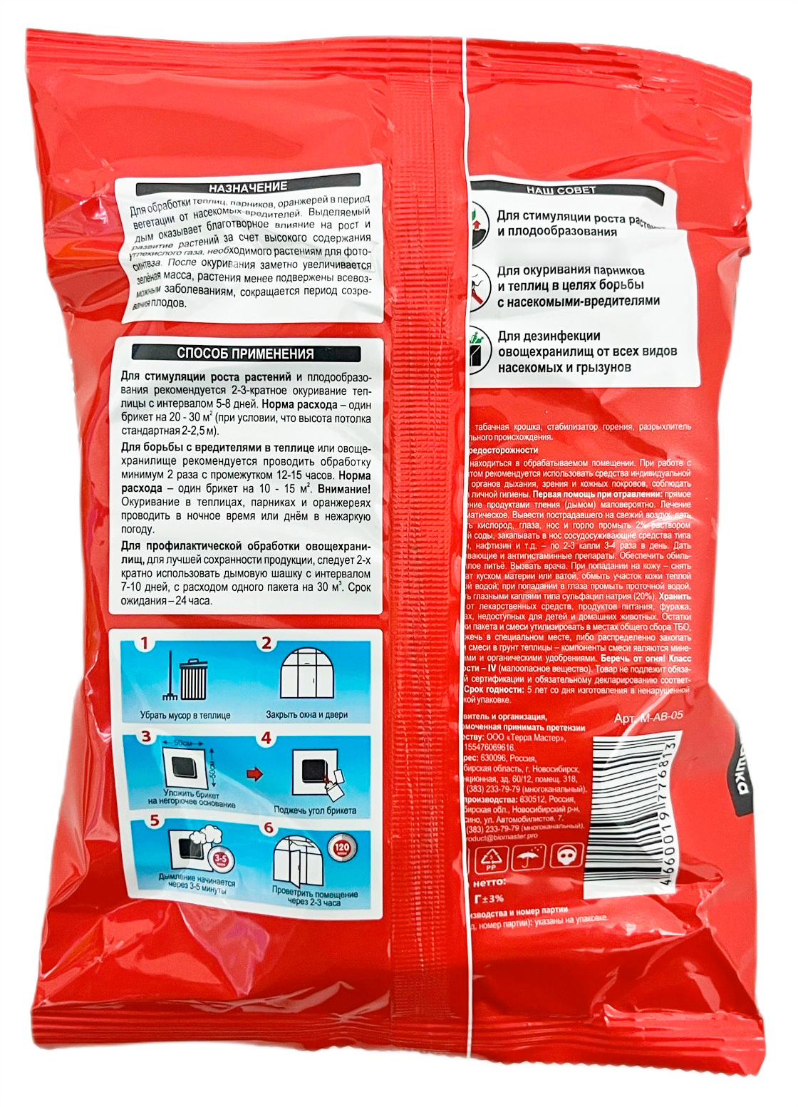 Для обработки теплиц, парников, оранжерей в период вегетации от насекомых-вредителей. Выделяемый дым оказывает благотворное влияние на рост и развитие растений за счет высокого содержания углекислого газа, необходимого растениям для фотосинтеза. После окуривания заметно увеличивается зелёная масса, растения менее подвержены всевозможным заболеваниям, сокращается период созревания плодов.