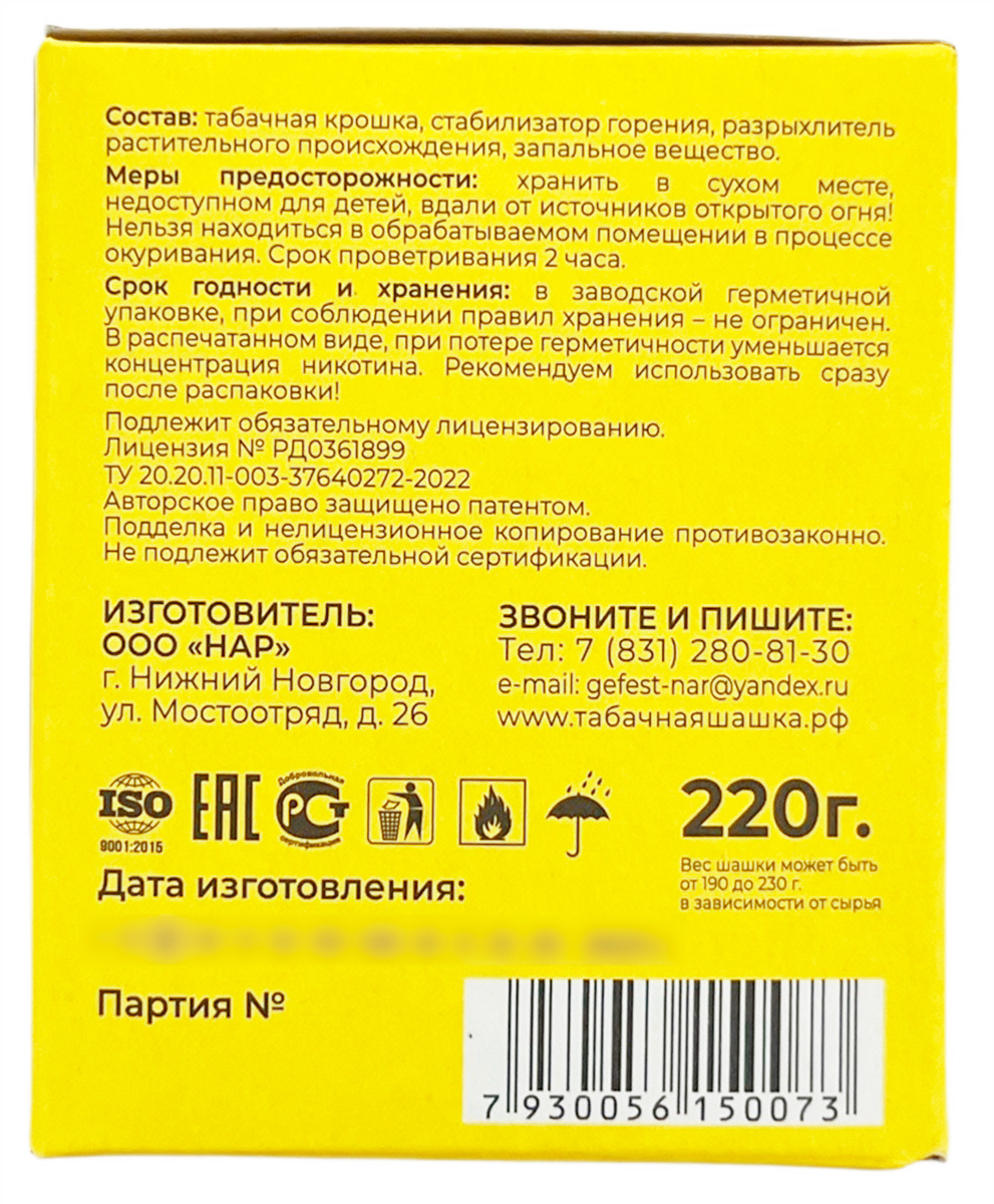 Состав: табачная крошка, стабилизатор горения, разрыхлитель растительного происхождения, запальное вещество.