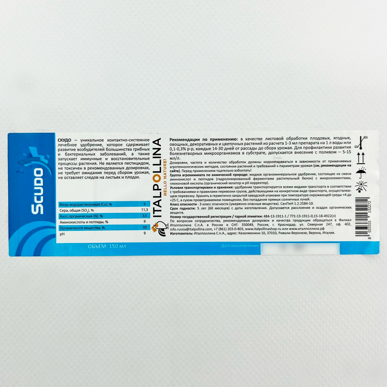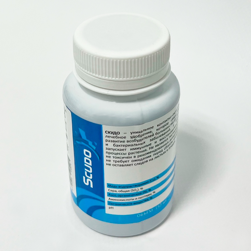 Scudo Скудо 150мл - защита и лечение от всходов до урожая.Органо-минеральное лечебное удобрение для листовых обработок, которое за счет сульфата меди сдерживает развитие возбудителей заболеваний, а также запускает иммунные и восстановительные механизмы растения благодаря высокому содержанию растительных аминокислот и органических веществ.