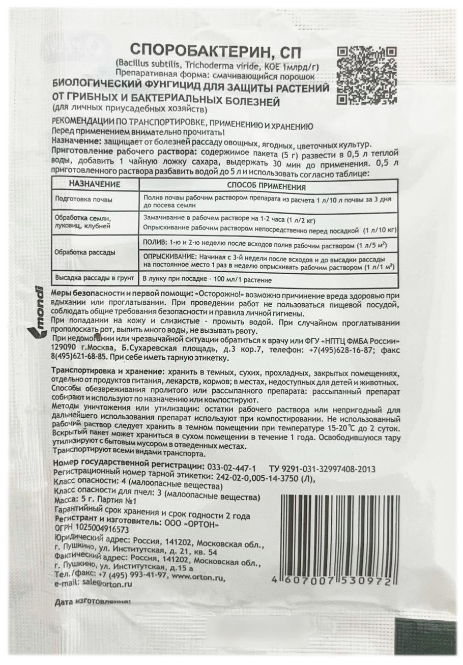 Биологический фунгицид СПОРОБАКТЕРИН-РАССАДА от фитофтороза и гнилей 5гСовременная препаративная форма. Содержит споры бактерий и грибов Bacillus subtilis и Trichoderma viride.