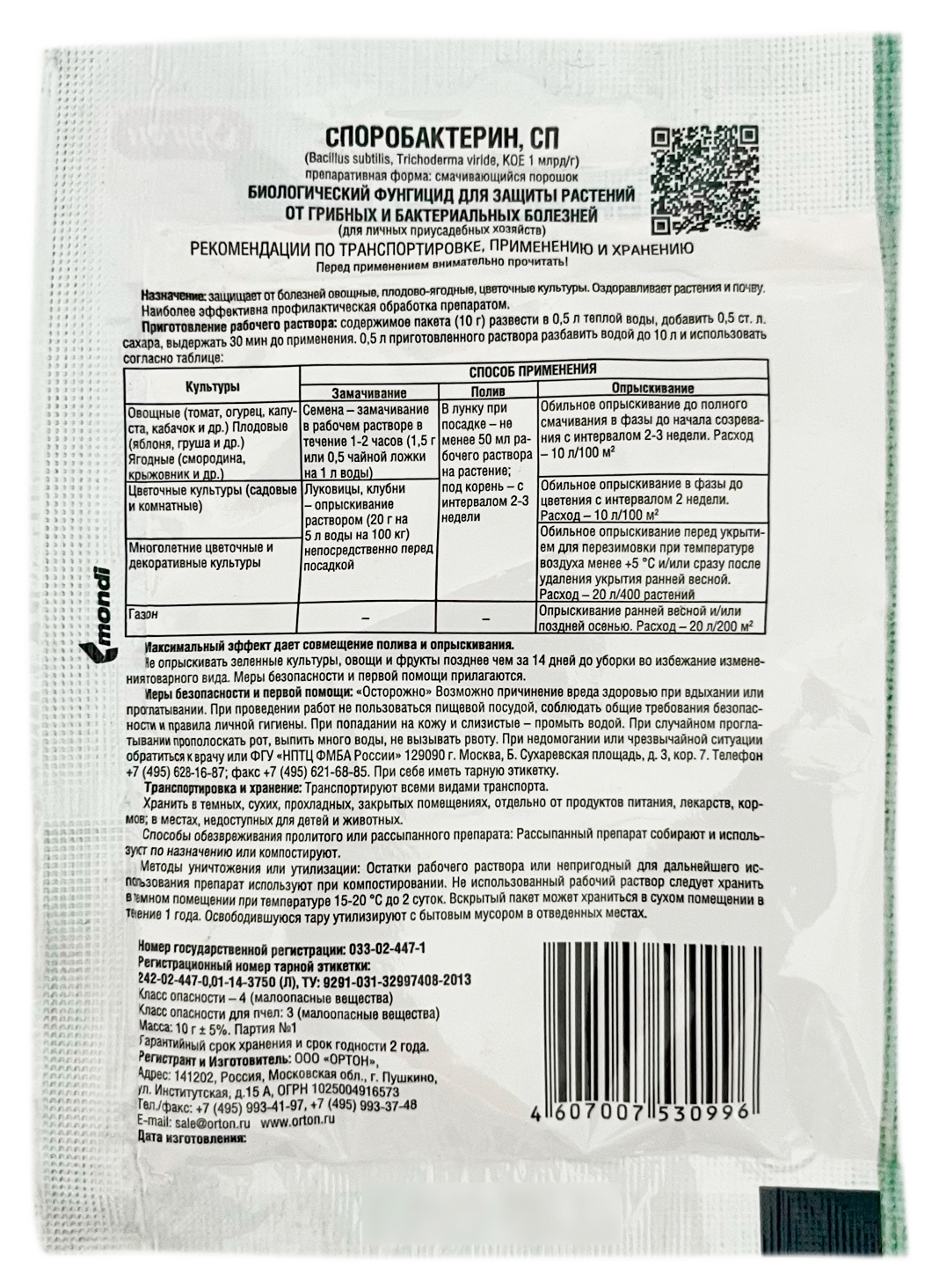 Споробактерин-вегетация 10г ОРТОНБиологический фунгицид для защиты растений от грибных и бактериальных болезней. Современная препаративная форма.