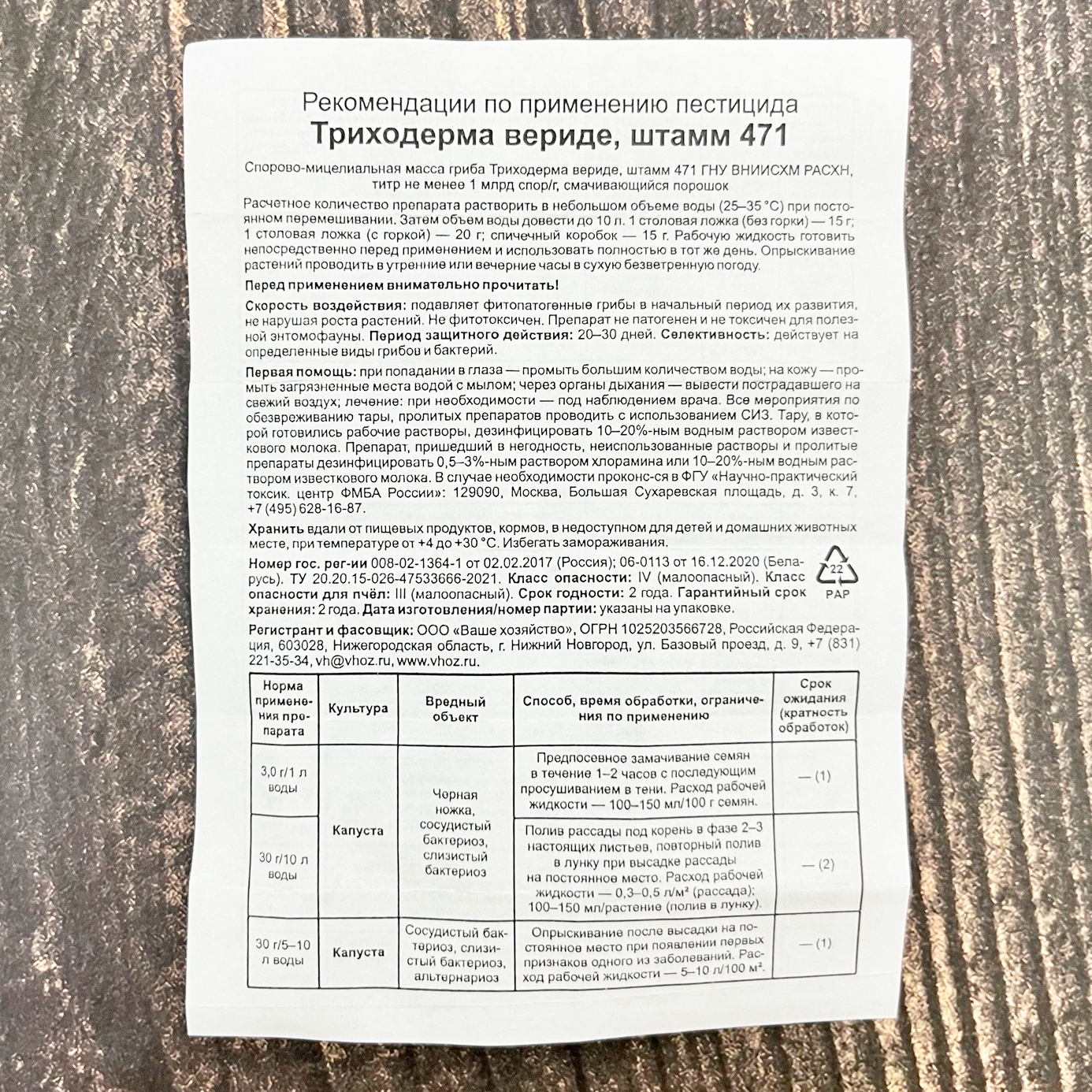 Триходерма Вериде 120г Ваше ХозяйствоЭффективный биопрепарат на основе дружественных культурных растениям микроскопических грибов для защиты растений от болезней (корневых и плодовых гнилей, черной ножки, белой и серой гнили, макроспориоза, фузариоза, фитофтороза, антракноза, вилта).