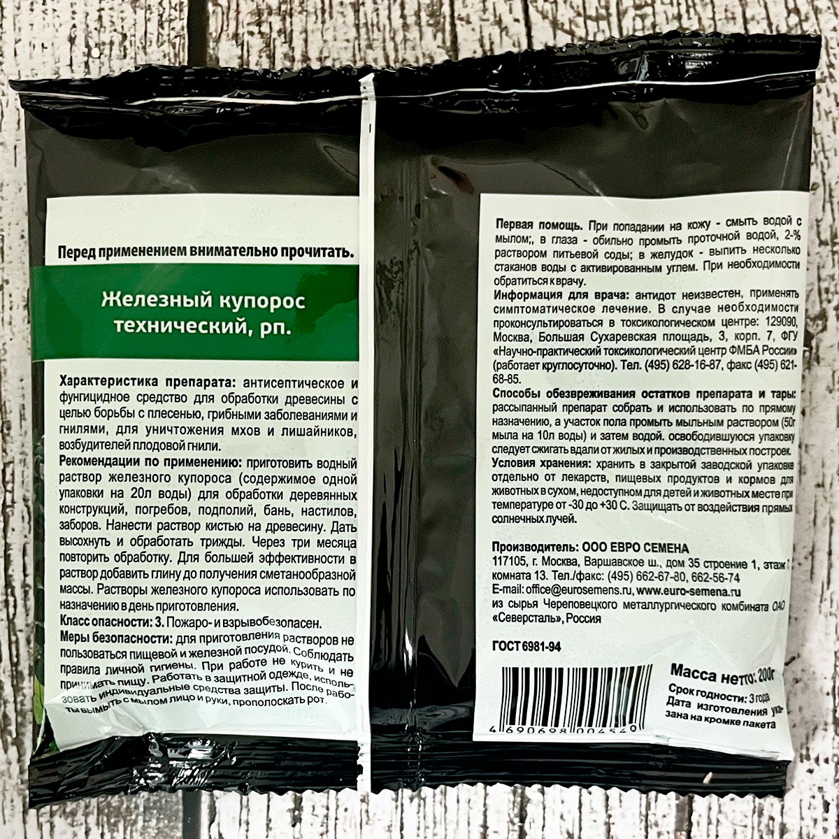 Железный купорос, технический, рп 200гАнтисептическое и фунгицидное средство для обработки древесины с целью борьбы с плесенью, грибными заболеваниями и гнилями, для уничтожения мхов и лишайников, возбудителей плодовой гнили.