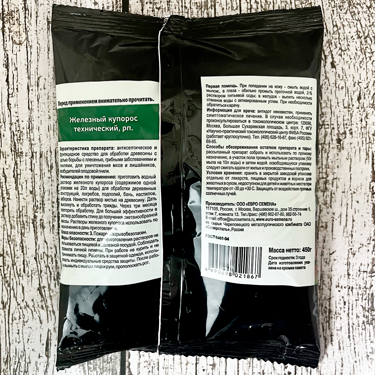 Железный купорос, технический, рп 450гАнтисептическое и фунгицидное средство для обработки древесины с целью борьбы с плесенью, грибными заболеваниями и гнилями, для уничтожения мхов и лишайников, возбудителей плодовой гнили.